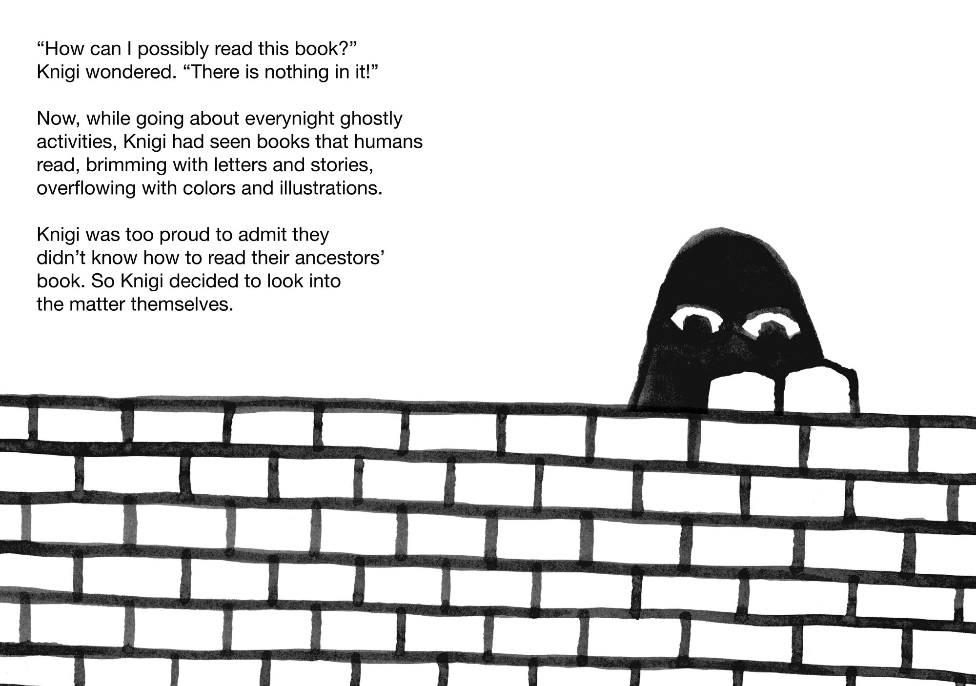 Pour son anniversaire, le petit fantôme Knigi reçoit un livre de sa tante Abel qui lui dit simplement en le lui donnant : « j'espère que tu prendras plaisir à le lire ! ».