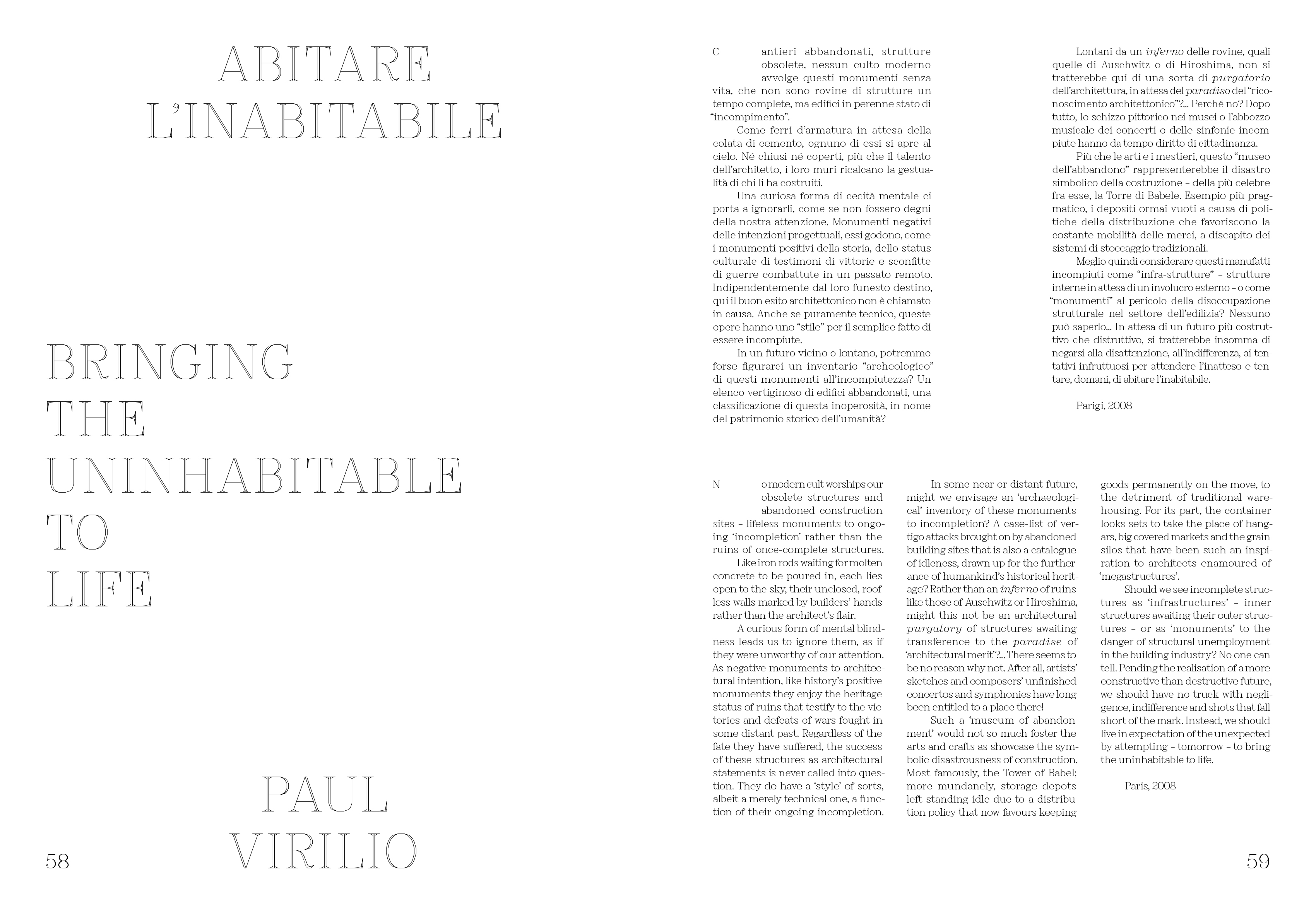 présente une étude collective pionnière consacrée au phénomène des constructions abandonnées en Italie. L'ouvrage comprend des contributions de Salvatore Settis, Robert Storr, Marc Augé,