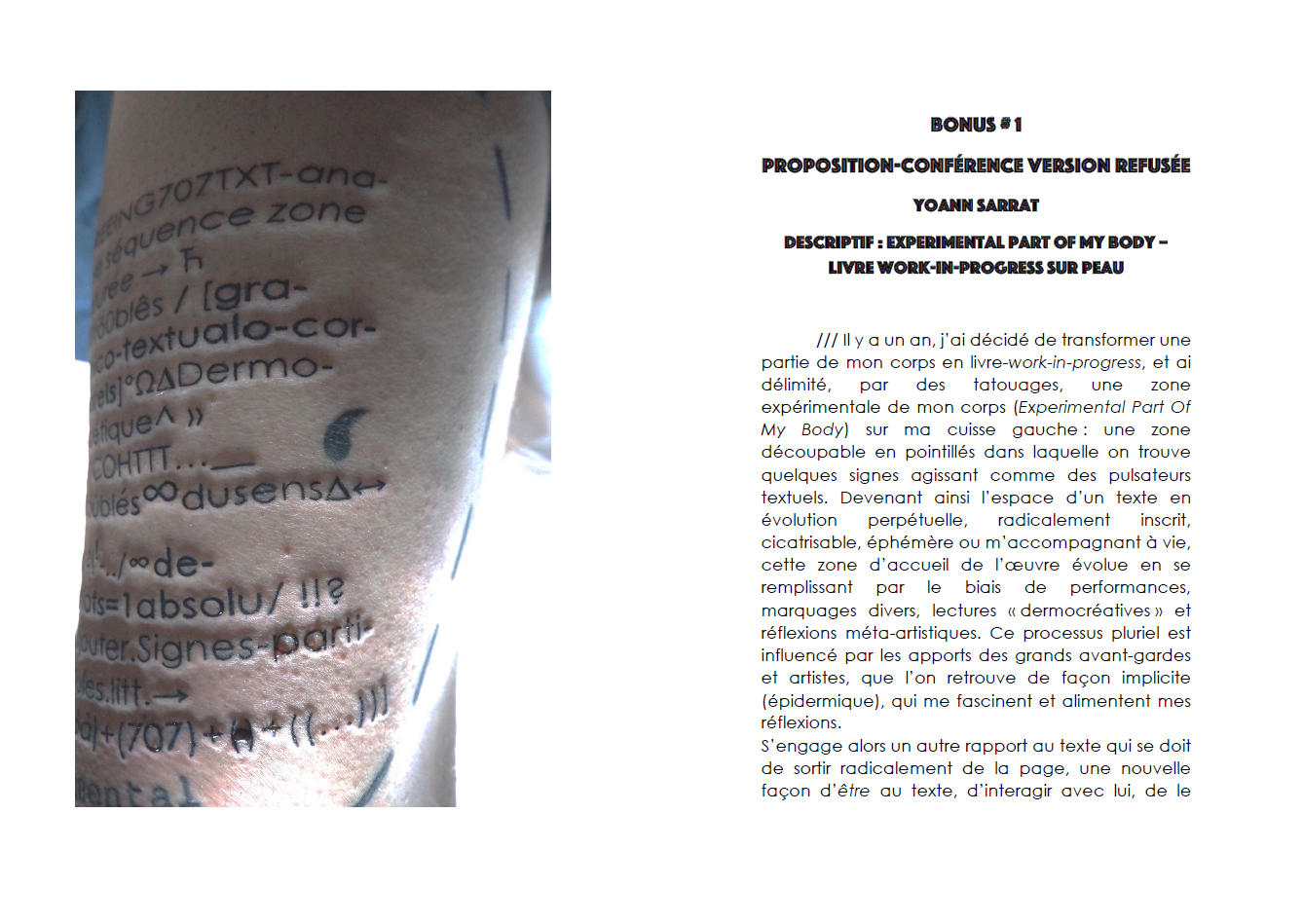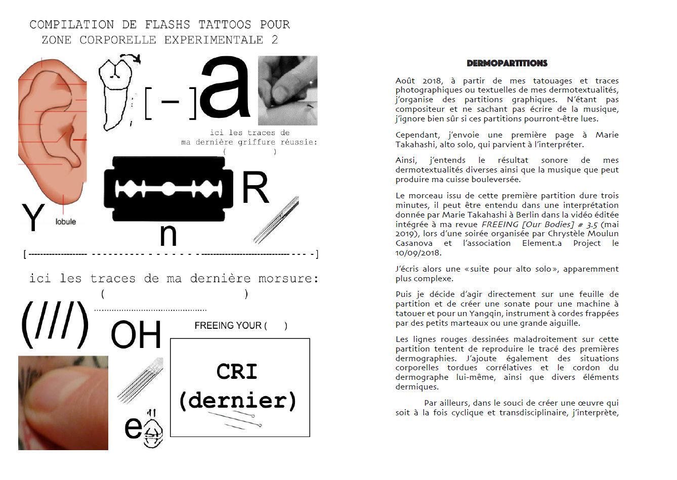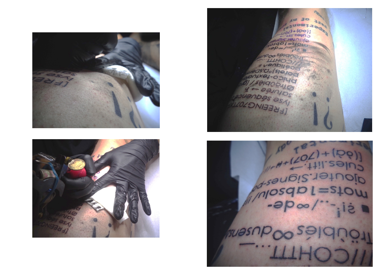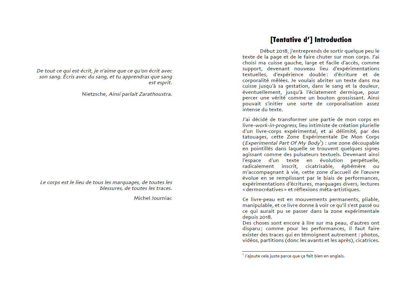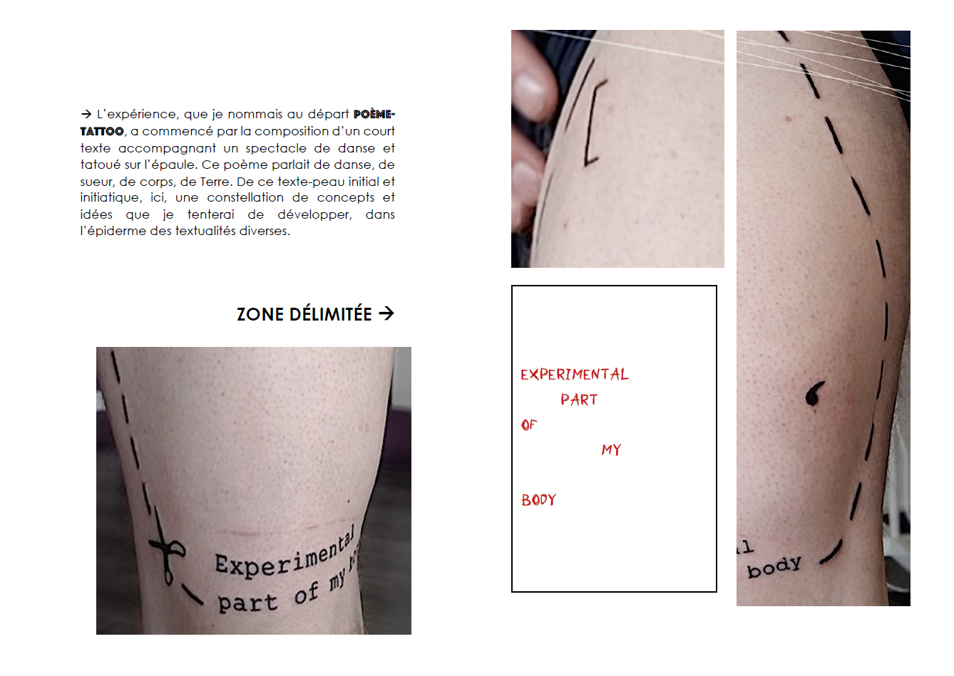 « J'ai décidé de transformer une partie de mon corps en livre-work-in-progress, lieu intimiste de création plurielle d'un livre-corps expérimental, et j'ai délimité, par des tatouages, cette Zone expérimentale de mon corps : une zone découpable en pointillés dans laquelle se trouvent quelques signes agissant comme des pulsateurs textuels. Devenant ainsi l'espace d'un texte en évolution perpétuelle, radicalement inscrit, cicatrisable, éphémère ou m'accompagnant à vie, cette zone d'accueil de l'œuvre évolue en se remplissant par le biais de performances, expérimentations d'écritures, marquages divers, lectures "dermocréatives" et réflexions méta-artistiques.