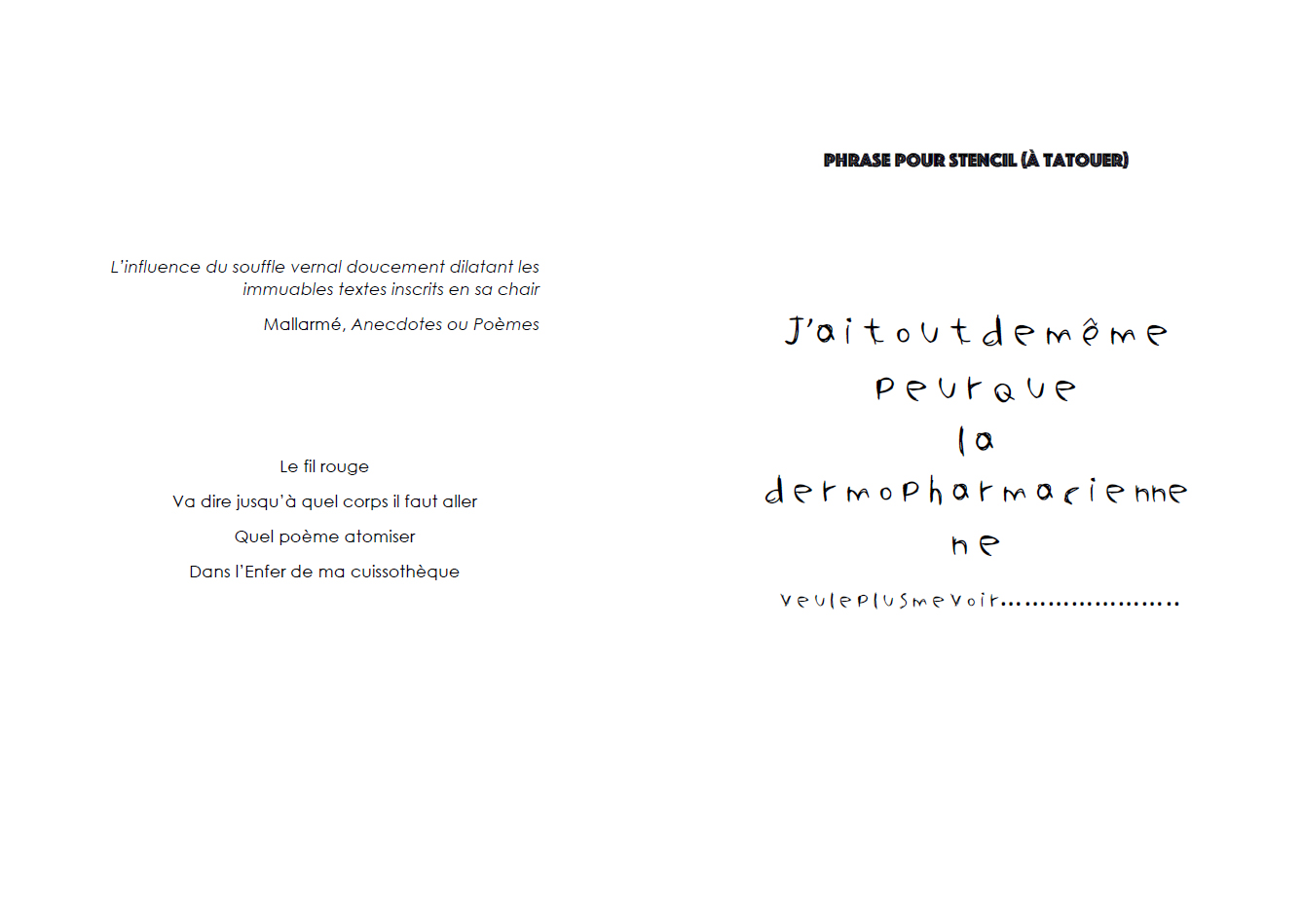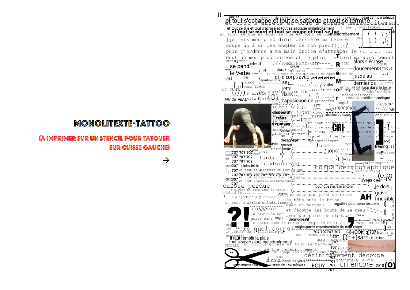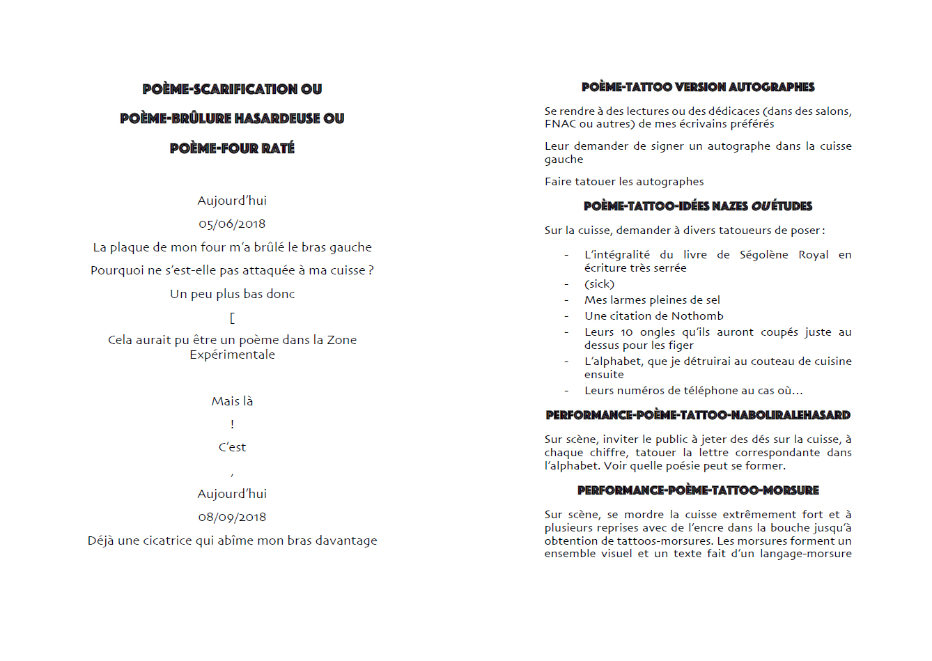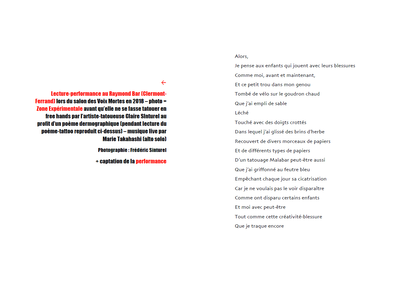 « J'ai décidé de transformer une partie de mon corps en livre-work-in-progress, lieu intimiste de création plurielle d'un livre-corps expérimental, et j'ai délimité, par des tatouages, cette Zone expérimentale de mon corps : une zone découpable en pointillés dans laquelle se trouvent quelques signes agissant comme des pulsateurs textuels. Devenant ainsi l'espace d'un texte en évolution perpétuelle, radicalement inscrit, cicatrisable, éphémère ou m'accompagnant à vie, cette zone d'accueil de l'œuvre évolue en se remplissant par le biais de performances, expérimentations d'écritures, marquages divers, lectures "dermocréatives" et réflexions méta-artistiques.