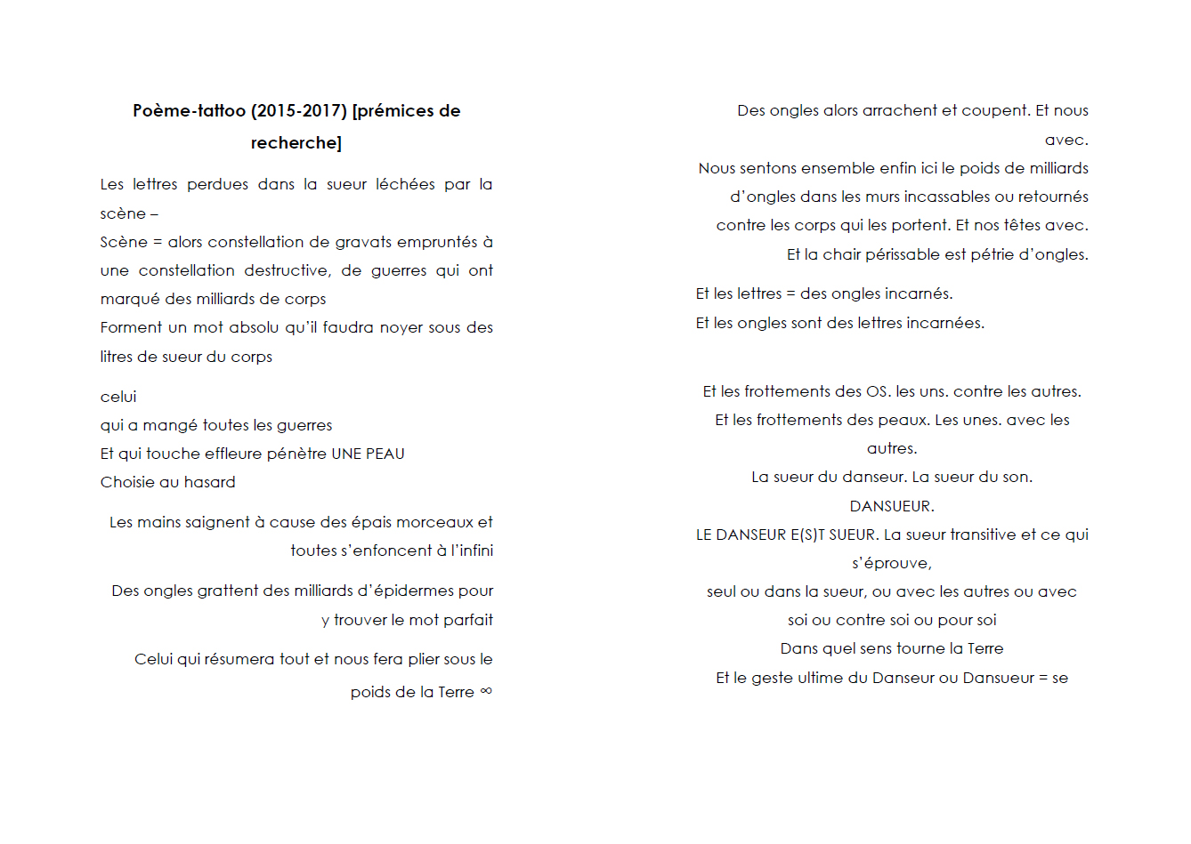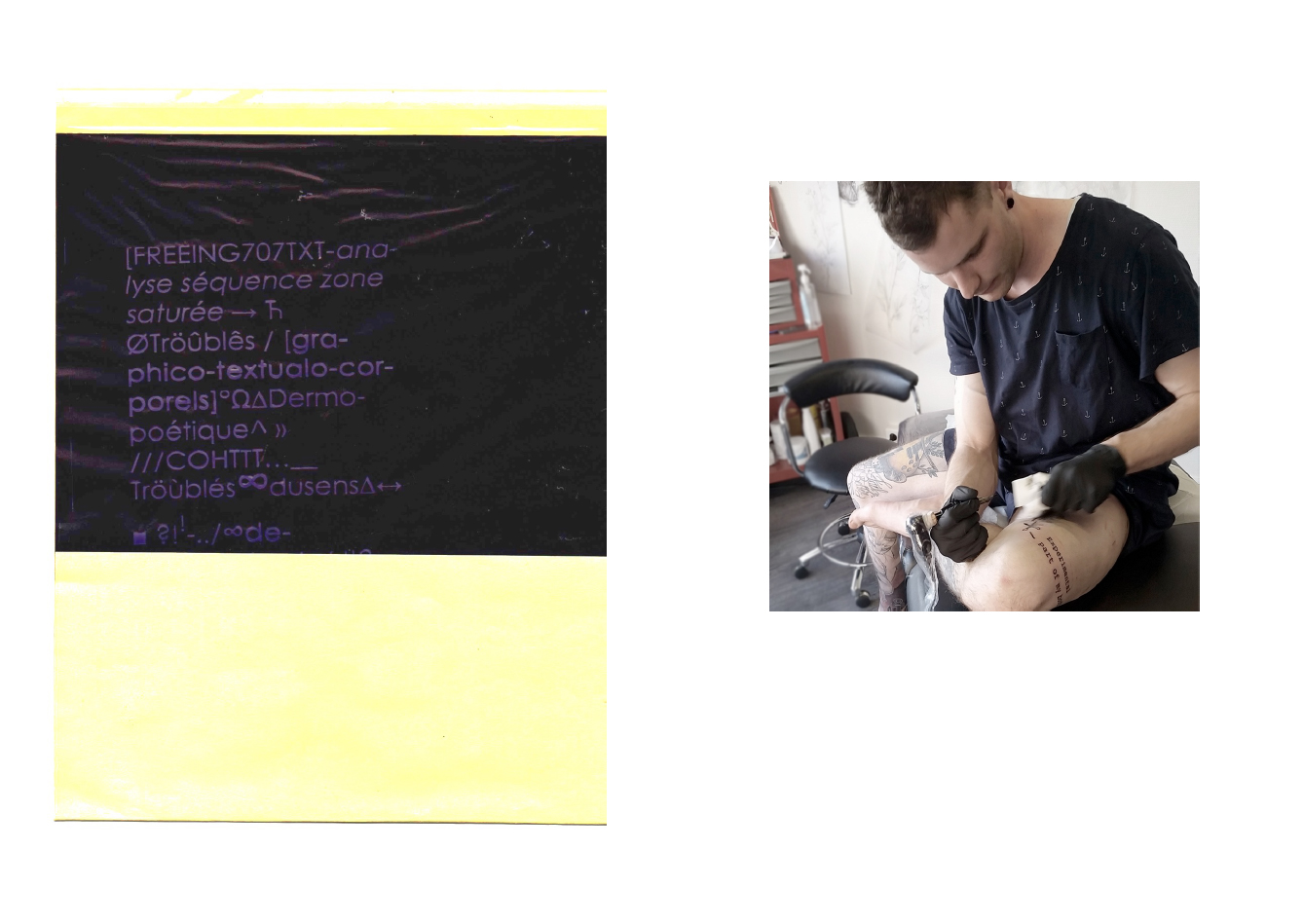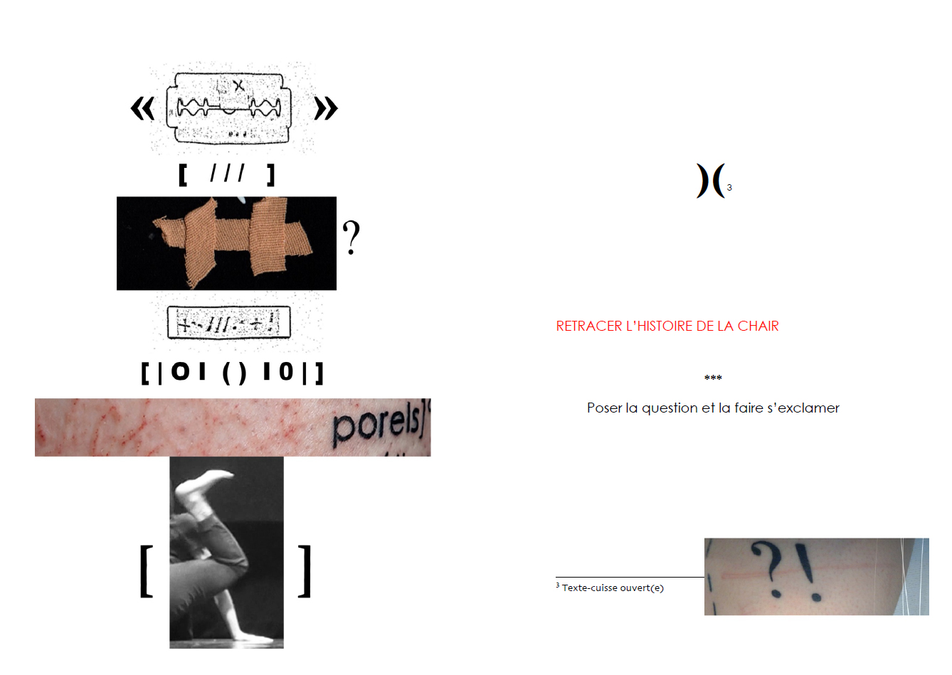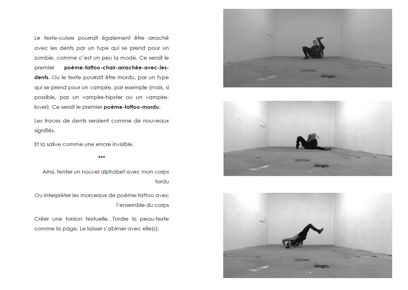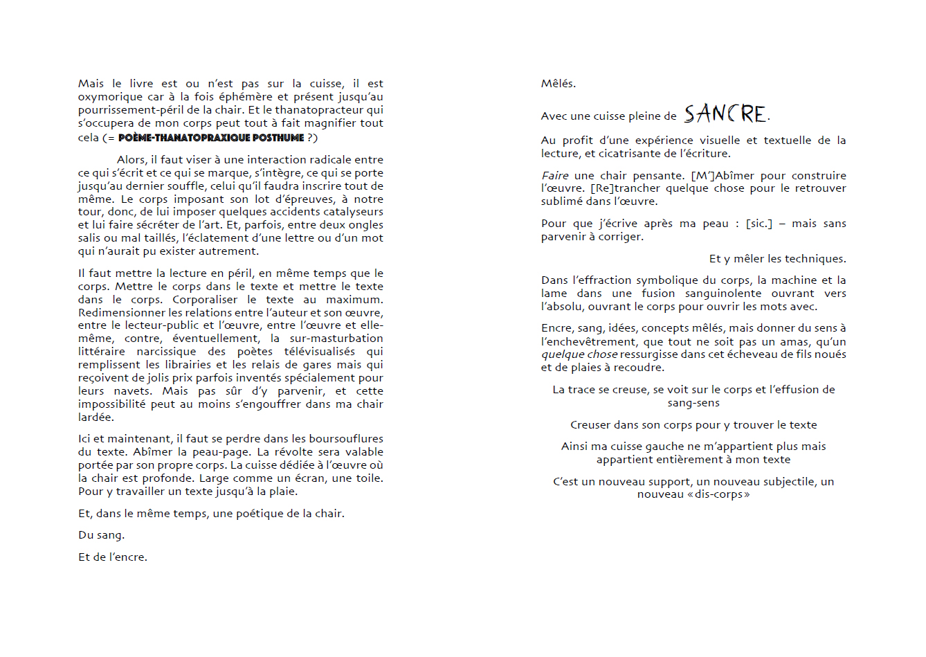 « J'ai décidé de transformer une partie de mon corps en livre-work-in-progress, lieu intimiste de création plurielle d'un livre-corps expérimental, et j'ai délimité, par des tatouages, cette Zone expérimentale de mon corps : une zone découpable en pointillés dans laquelle se trouvent quelques signes agissant comme des pulsateurs textuels. Devenant ainsi l'espace d'un texte en évolution perpétuelle, radicalement inscrit, cicatrisable, éphémère ou m'accompagnant à vie, cette zone d'accueil de l'œuvre évolue en se remplissant par le biais de performances, expérimentations d'écritures, marquages divers, lectures "dermocréatives" et réflexions méta-artistiques.