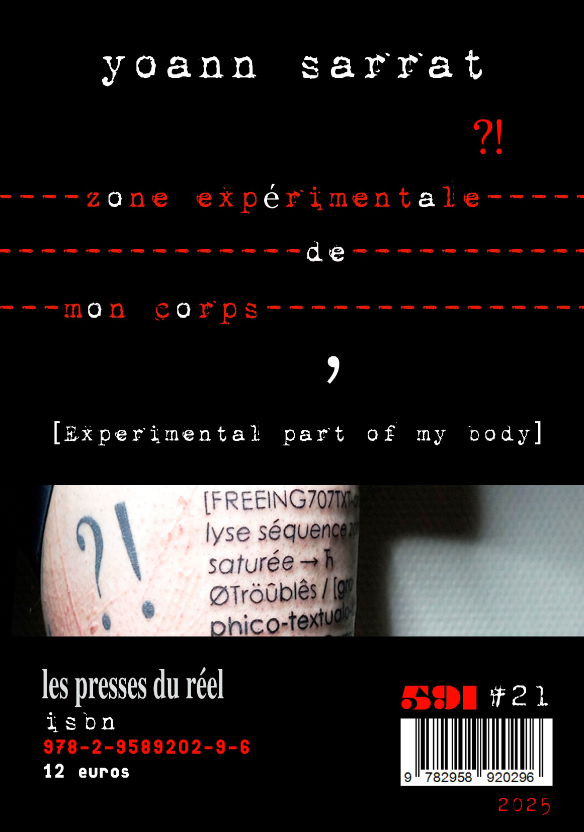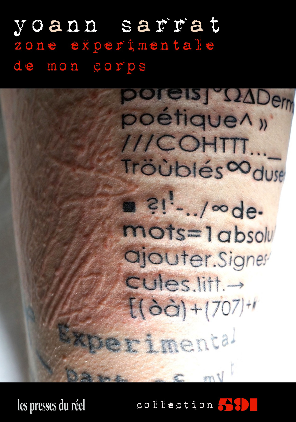 Avec Zone expérimentale de mon corps, Yoann Sarrat propose un recueil témoignant de sa pratique de l'écriture performative mêlée au tatouage (avec et sans encre – qu'il nomme « poésie dermographique ») et à la danse, à travers divers prismes : l'ancrage théorique et conceptuel, la partition de performance, la poésie expérimentale et visuelle et la photographie donnant à voir toutes les « séquelles » de cette forme poétique tout comme sa mise en jeu scénique.