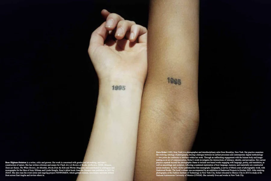 Rene Matić en conversation avec Bianca Stoppani ; Josiane M.H. & Emily Pozi ; Olivia Kan-Sperling en conversation avec Jamieson Webster ; Olivia van Kuiken par P. Eldridge ; Tasneem Sarkez par Leo Cocar ; focus sur Mexico City : El Desagüe par Luis Ortega Govela ; alfatih en conversation avec Jazmina Figueroa ; Ruoru Mou en conversation avec Olivia Aherne ; Adam Patrick Grant par Michela Ceruti ; Siyi Li par Margaret Kross ; Ruofan Chen par Matthew Lawson Garrett ; Megan Mi-Ai Lee en conversation avec Marie Catalano ; Tommy Xie en conversation avec Moa Jegnell ; davi de jesus do nascimento par Mateus Nunes ; un essai visuel de Zora Sicher (texte de Rose Higham-Stainton) ; comptes-rendus : « to ignite our skin » SculptureCenter, New York par Qingyuan Deng ; Basel Abbas & Rouanne Abou-Rahme « Prisoners of Love: Until the Sun of Freedom » Nottingham Contemporary par Amy Jones ;