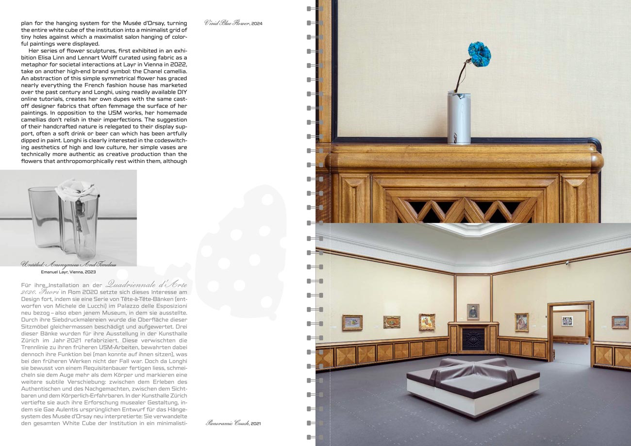 Lorenza Longhi (née en 1991 à Lecco, en Italie) est une artiste basée à Zurich formée à l'ECAL à Lausanne et à l'Accademia di Belle Arti di Brera à Milan. Sa pratique s'articule autour de la circulation des images, des matériaux et des systèmes de valeurs dans la culture de consommation. Travaillant à la fois avec la sérigraphie, la sculpture, l'installation et le mobilier reconstruit, elle réinterprète souvent des objets familiers et des éléments de design afin de mettre en évidence les tensions subtiles qui s'y cachent. En manipulant les surfaces, les textures et les processus de production, elle révèle comment l'esthétique régule les comportements sociaux, le statut et les aspirations. Ses objets, qu'il s'agisse de panneaux imprimés ou de formes hybrides dérivées de la décoration intérieure, soulignent l'instabilité du sens lorsque les choses passent d'un cadre domestique à un cadre commercial ou institutionnel.