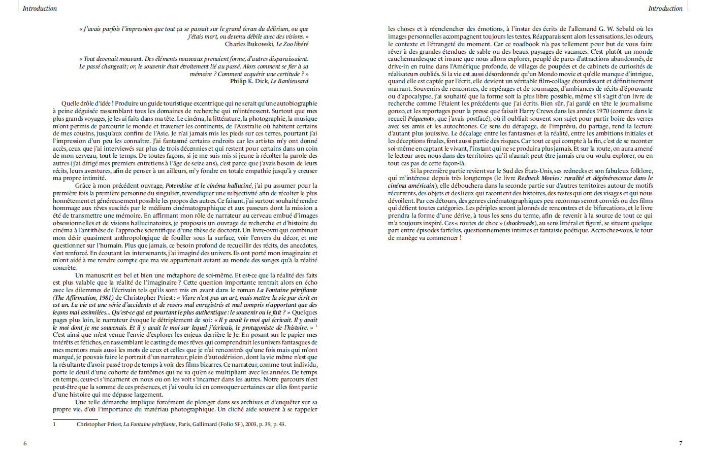 À l'appui d'images nombreuses comme autant d'éléments d'une enquête, l'auteur revient sur des lieux de tournage de films, recueille la parole de cinéastes et d'écrivains et nous fait voyager dans le monde entier en nous racontant les aventures rocambolesques qui lui sont arrivées dans ces périples où la réalité dépasse toujours la fiction. Partant de sa passion pour le Sud des États-Unis et la richesse du cinéma qui en a émergé, Maxime Lachaud, déjà responsable de Redneck Movies : ruralité et dégénérescence dans le cinéma américain, convoque des décors souvent terrifiants, comme un anti guide de voyage sur tous les endroits à éviter dans le globe. Cette approche ludique n'en est pas dénuée d'une belle érudition, nous amenant à porter des regards nouveaux sur les films et sur les villes et environnements qui les ont inspirés. Sur le chemin, on déambule dans les ruines d'anciens drive-in sous le soleil rouge du Texas, on suit des parades étranges dans les bayous de Louisiane, on se rend dans des musées de poupées et de têtes réduites ou on se perd dans des parcs d'attractions à l'abandon. La distinction entre les expériences vécues et les inventions des réalisateurs devient floue, et le lecteur est immergé dans un univers fou, fantasque et multicolore qu'il n'a plus envie de quitter.