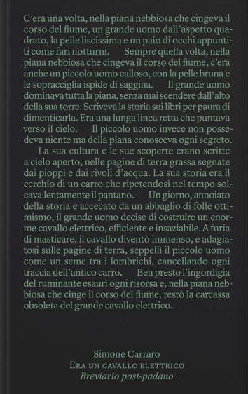 Imprimé en risographie en édition limitée à 250 exemplaires, le livre comprend 72 pages illustrées. Il raconte l'imaginaire archéologique d'une communauté future habitant les infrastructures abandonnées et les espaces incultes d'une vallée du Pô profondément transformée. Conçu comme un témoignage d'une époque à venir, Era un cavallo elettrico. Breviario post-padano présente une reformulation prophétique de la relation entre les humains et les écosystèmes de la « plaine brumeuse ». L'ouvrage offre un aperçu de la redécouverte de pratiques oubliées, ainsi que de la réinvention de certains symboles liés à la culture paysanne qui caractérisait autrefois la vallée du Pô avant son industrialisation généralisée.