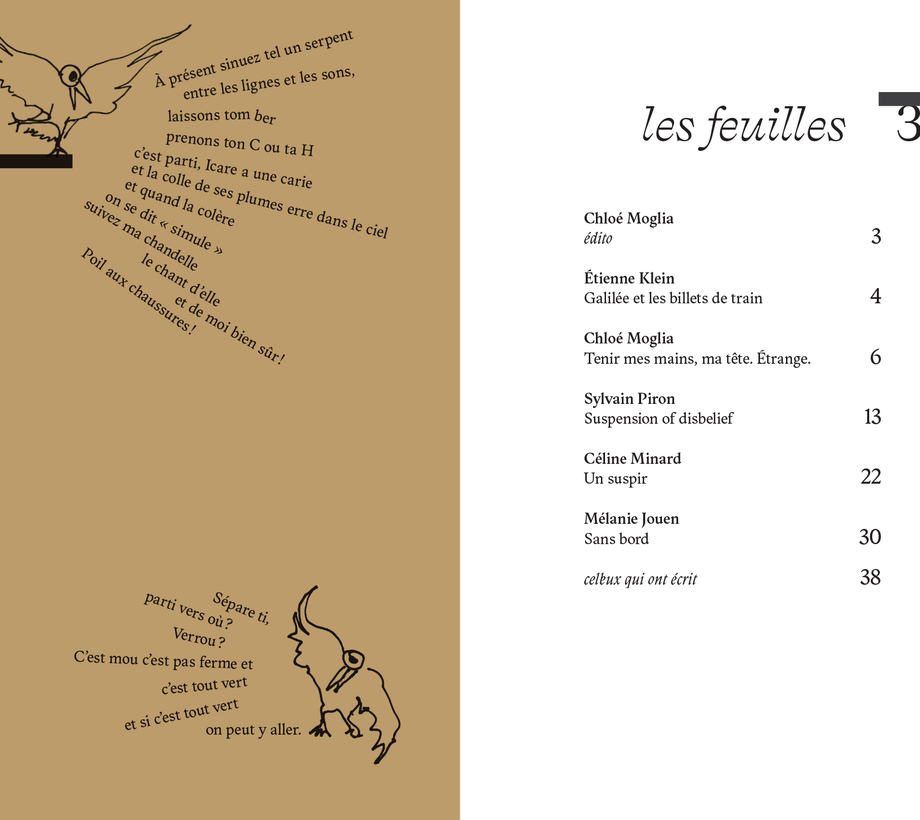 Initiée par l'artiste suspensive Chloé Moglia, publiée par la compagnie Rhizome, Les Feuilles est une revue qui accueille de manière saisonnière les écrits d'auteurices et chercheureuses autour de la pratique et de la notion de suspension.