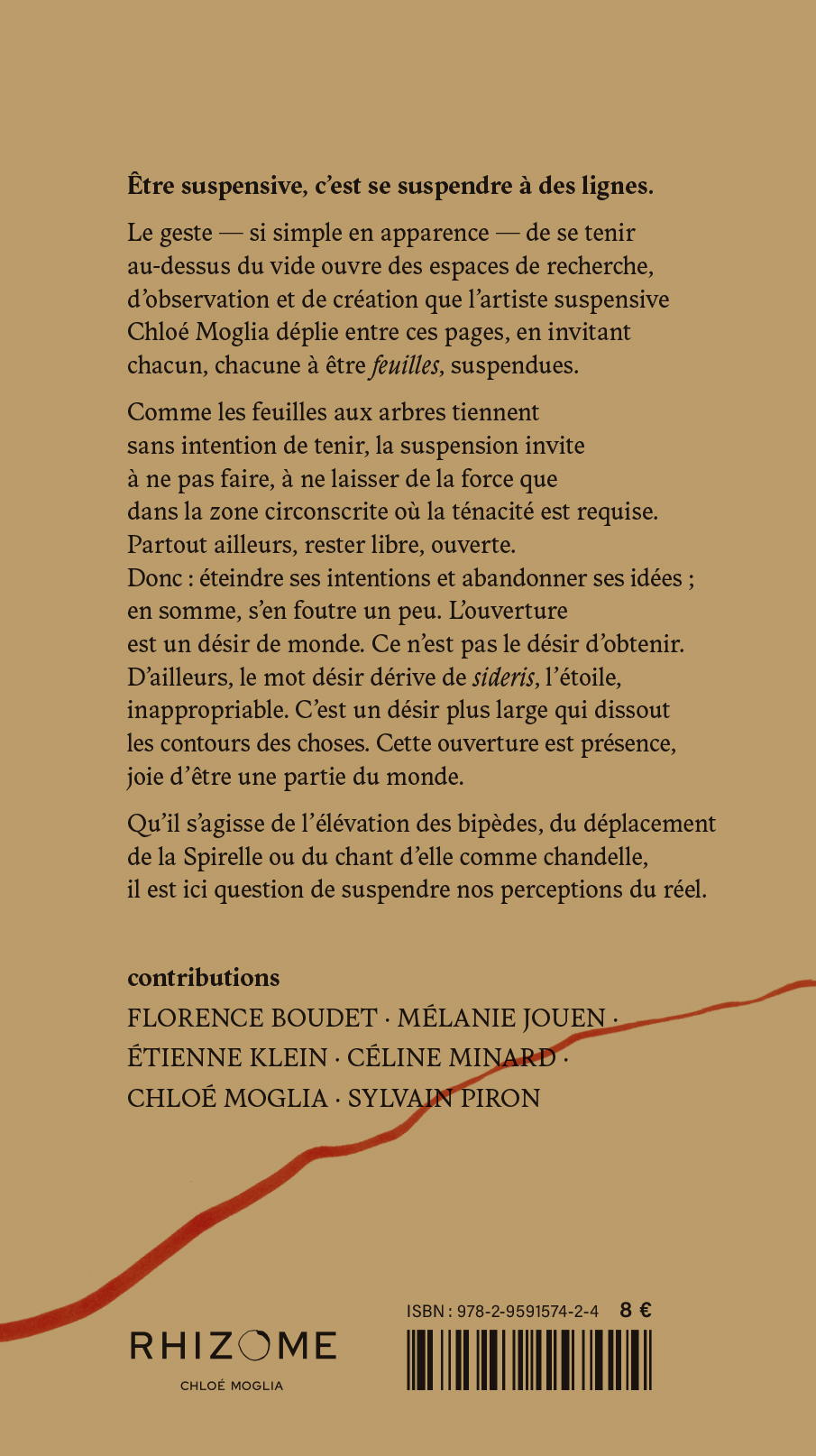 Le geste – si simple en apparence – de se tenir au-dessus du vide ouvre des espaces de recherche, d'observation et de création que l'artiste suspensive Chloé Moglia déplie entre ces pages, en invitant chacun, chacune à être feuilles, suspendues.