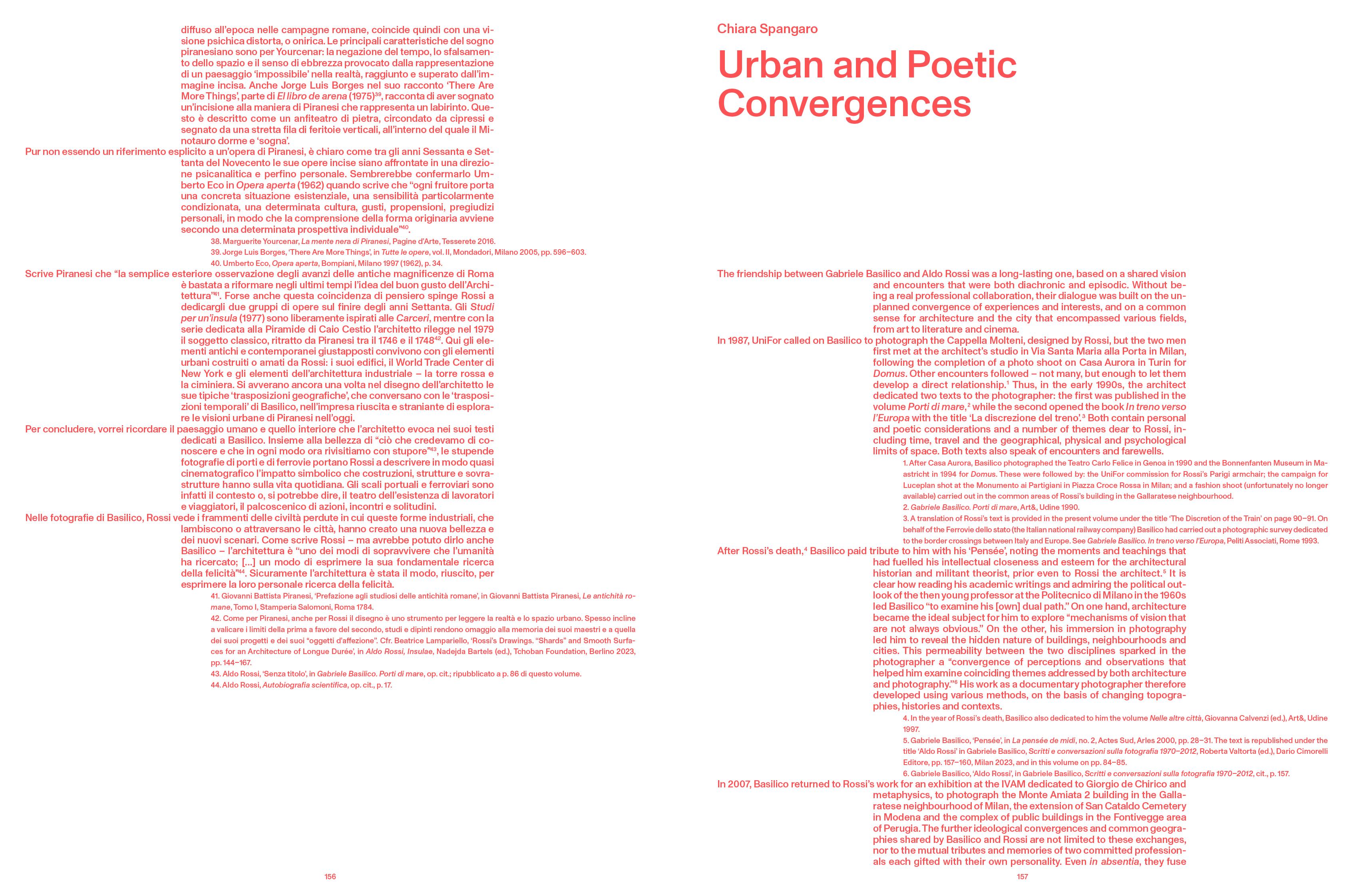 Cet ouvrage rassemble pour la première fois les photographies de Basilico consacrées à l'architecture de Rossi et est enrichi par des contributions de Chiara Spangaro et Pier Paolo Tamburelli, des notes de projet de Rossi, ainsi que des écrits qu'ils se sont dédiés l'un à l'autre.