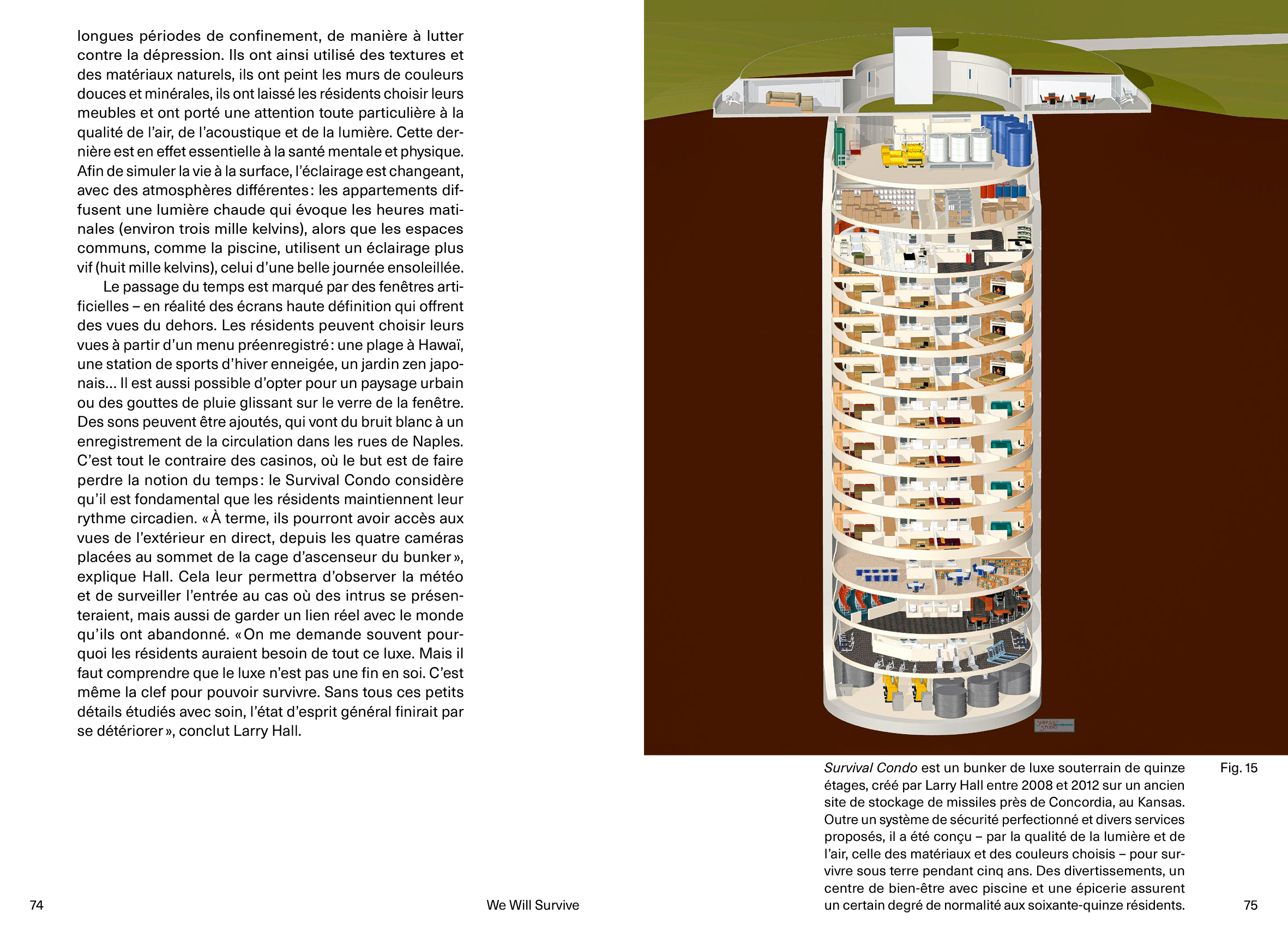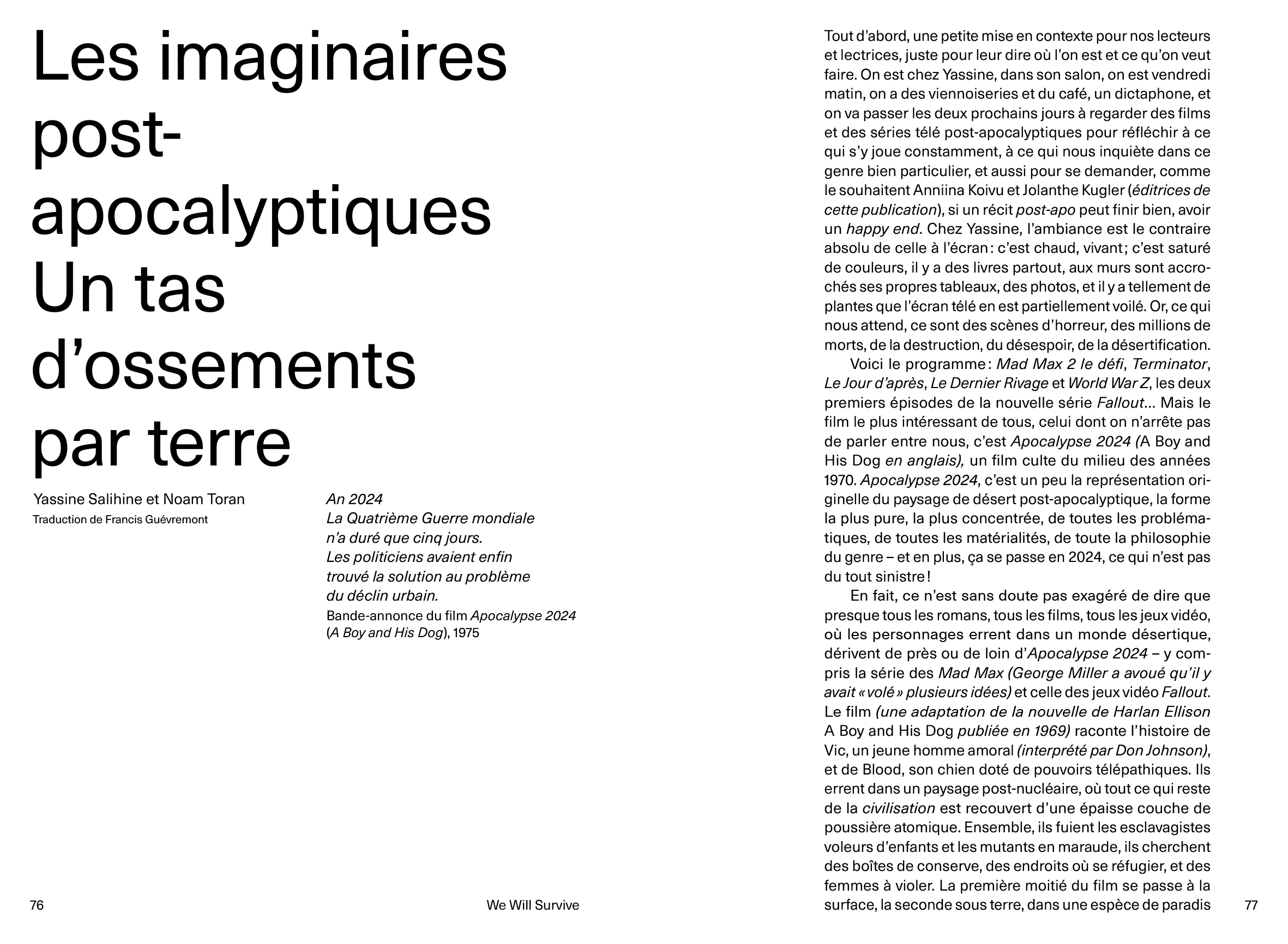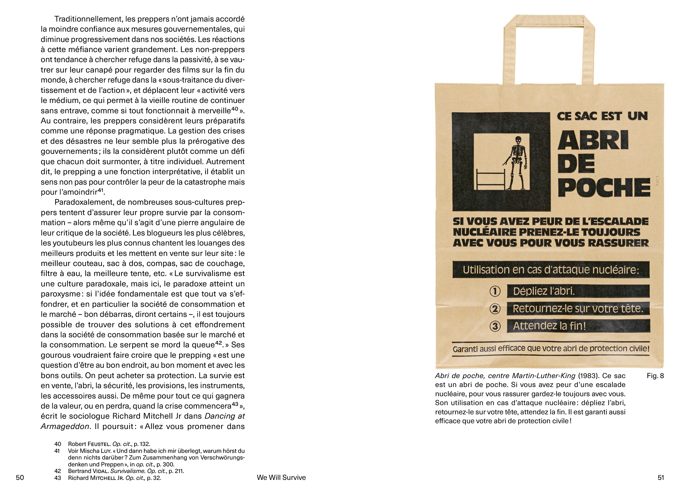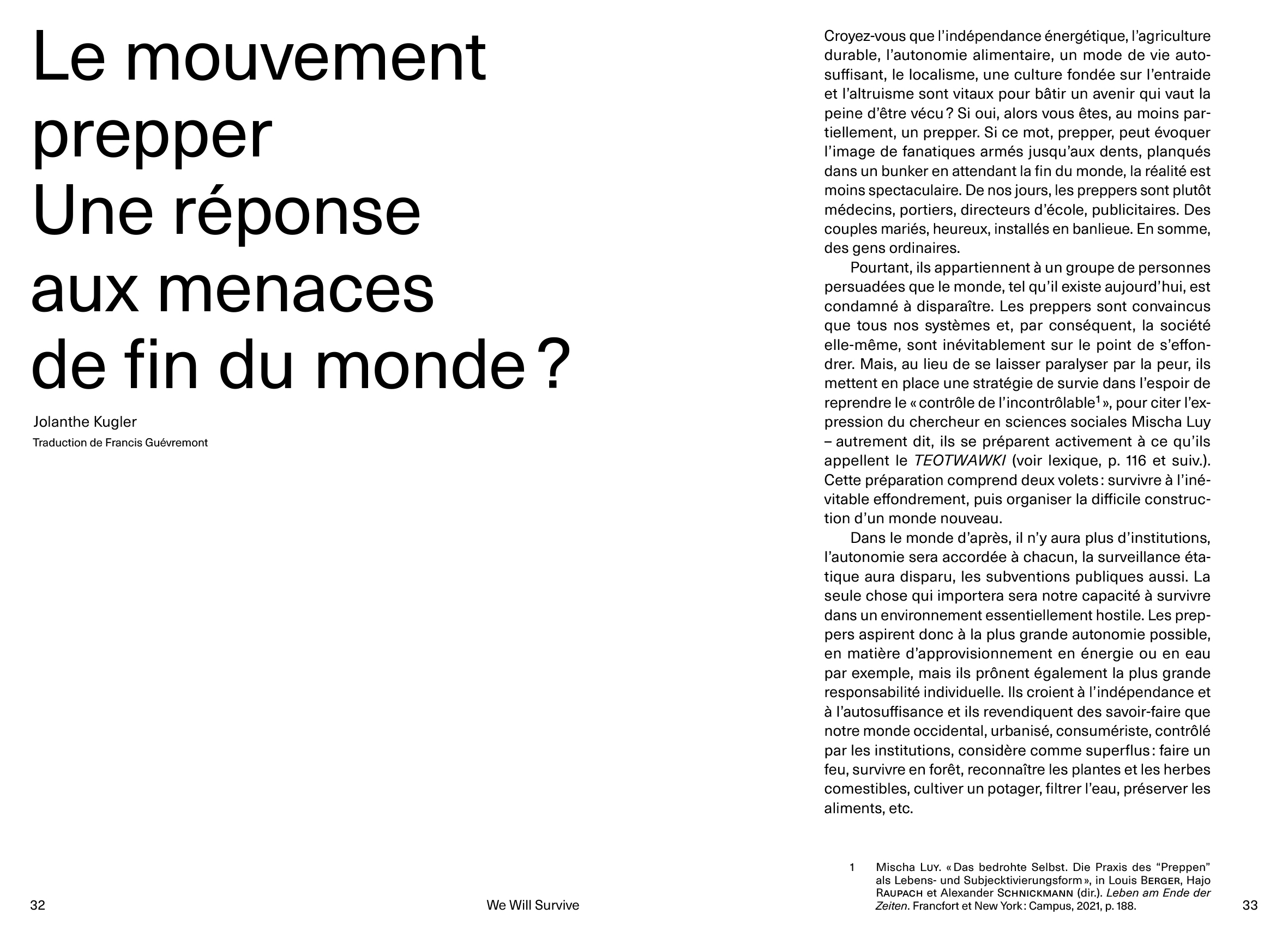 We Will Survive rassemble les points de vue de théoriciens, de chercheurs, de concepteurs et de preppers. Il explore les chemins de la pensée, la philosophie, et les styles de vie variés d'un mouvement autrefois considéré comme marginal, aujourd'hui devenu un phénomène culturel dans le monde entier.
