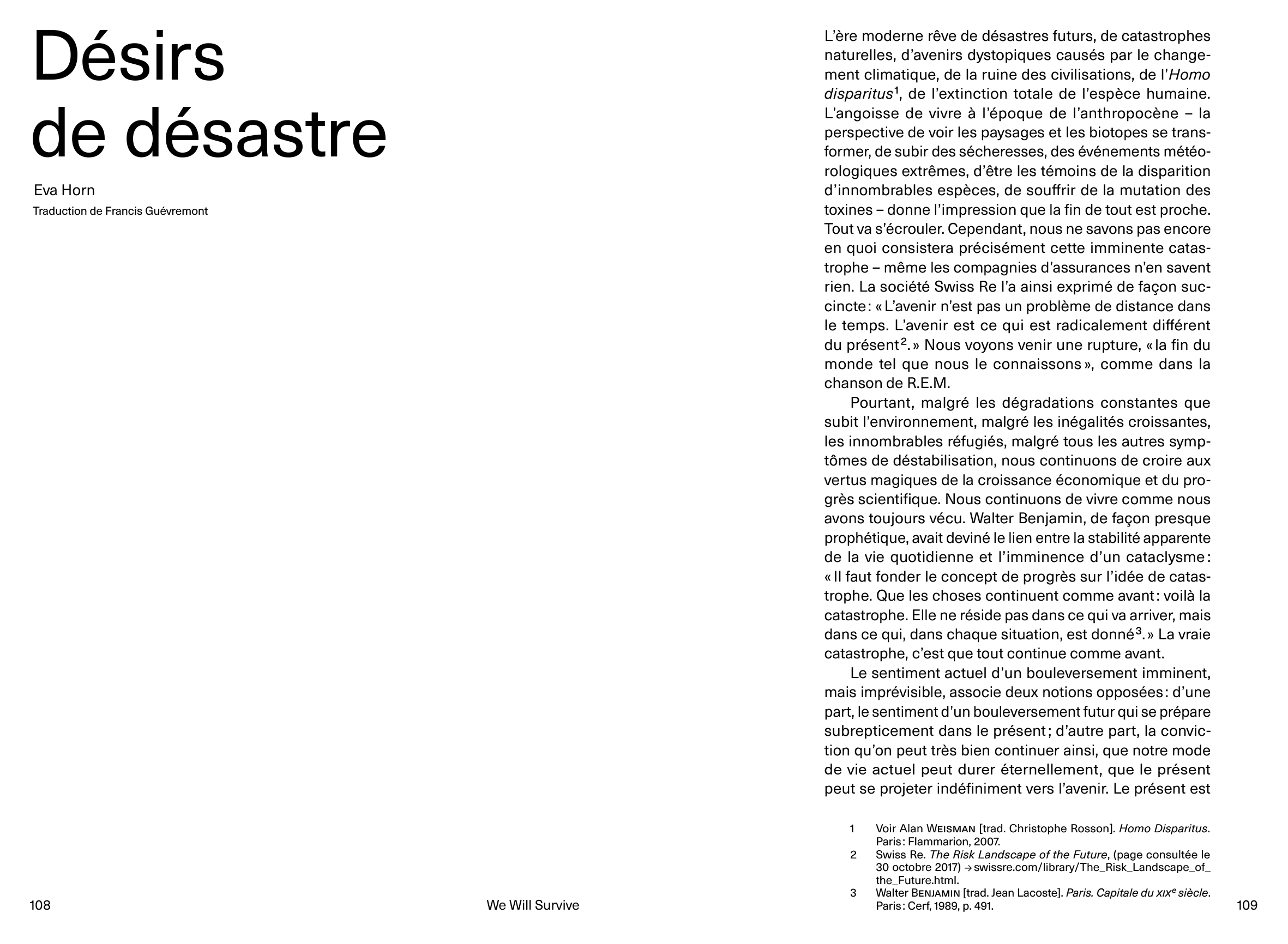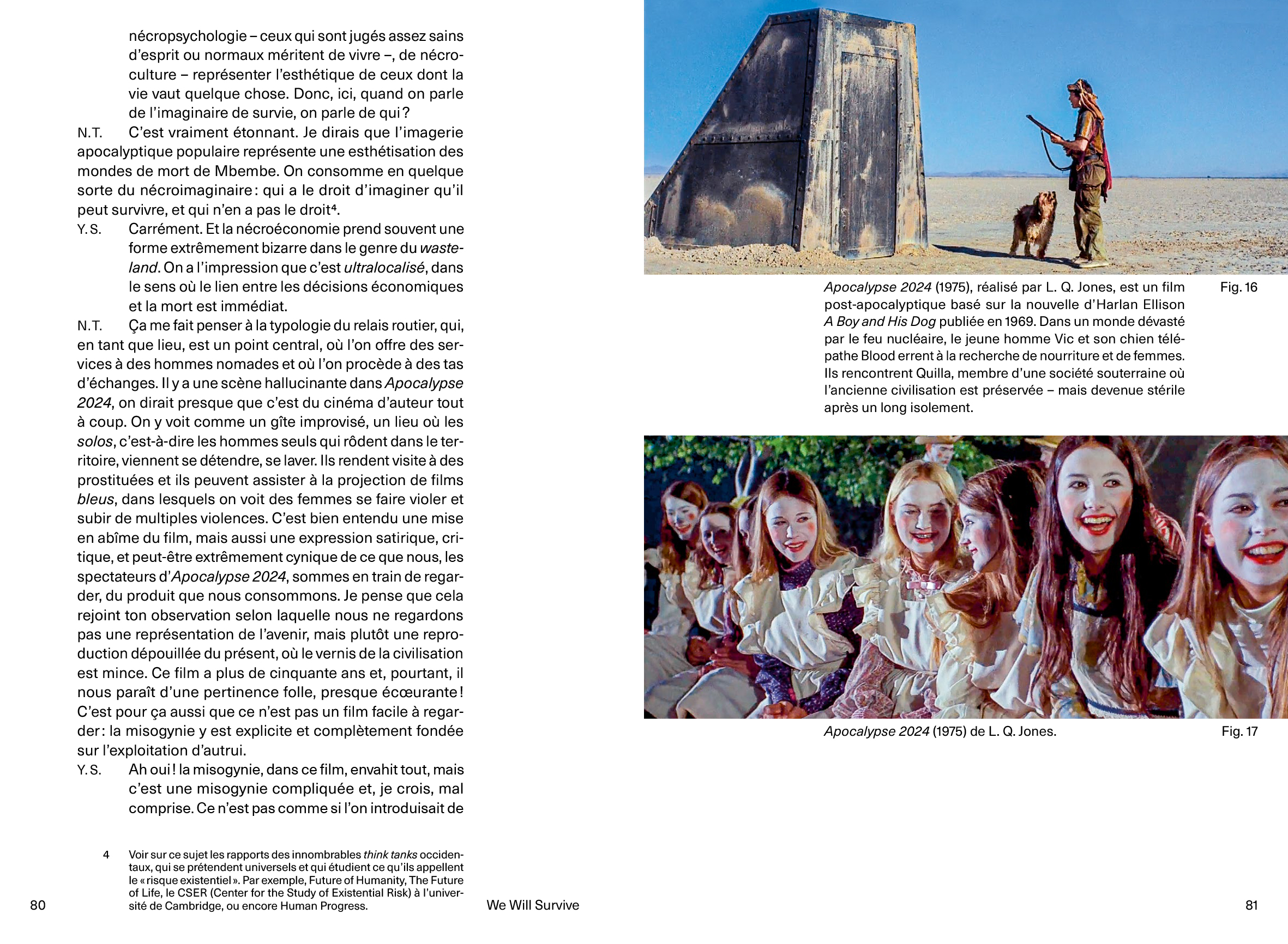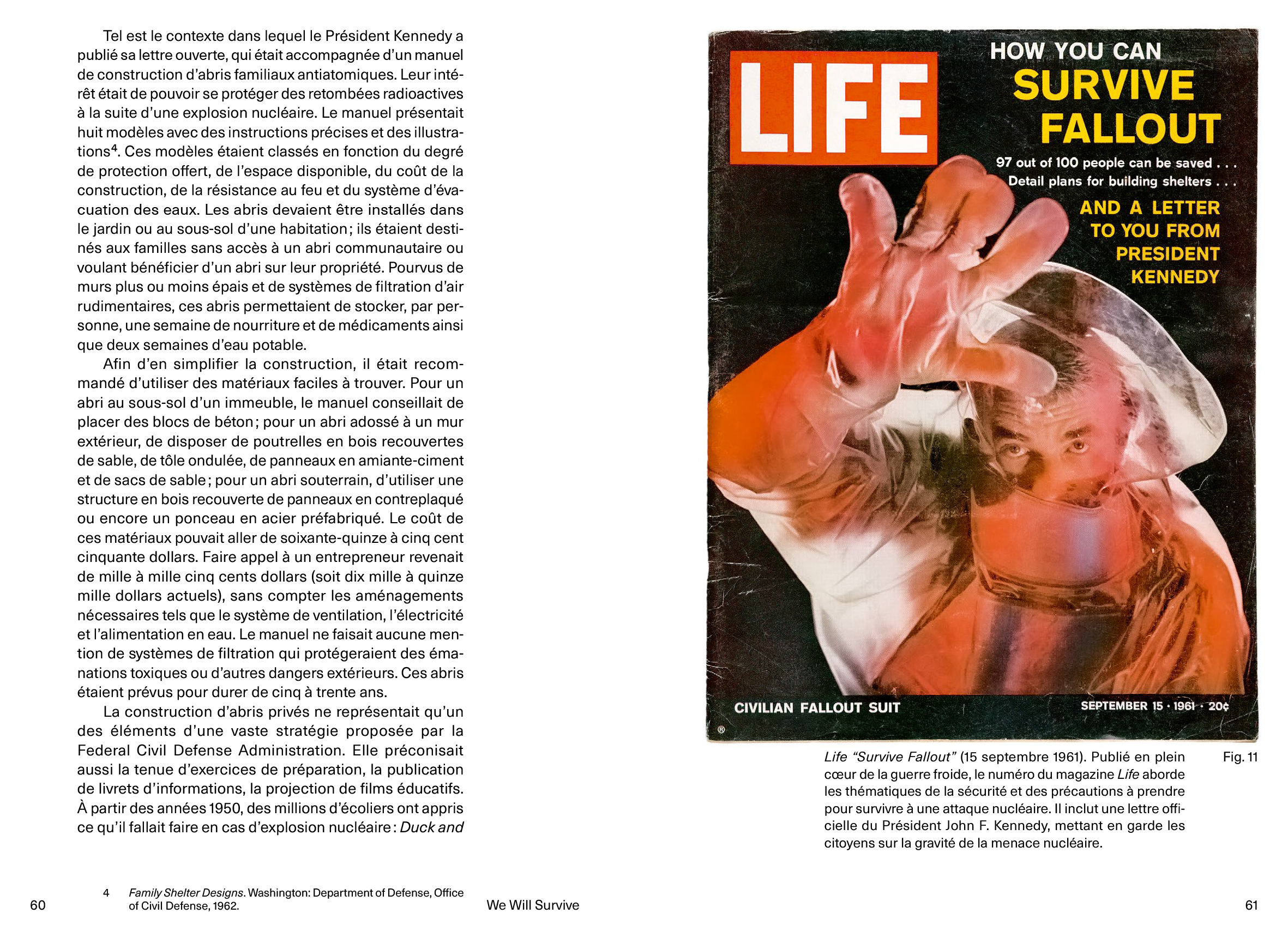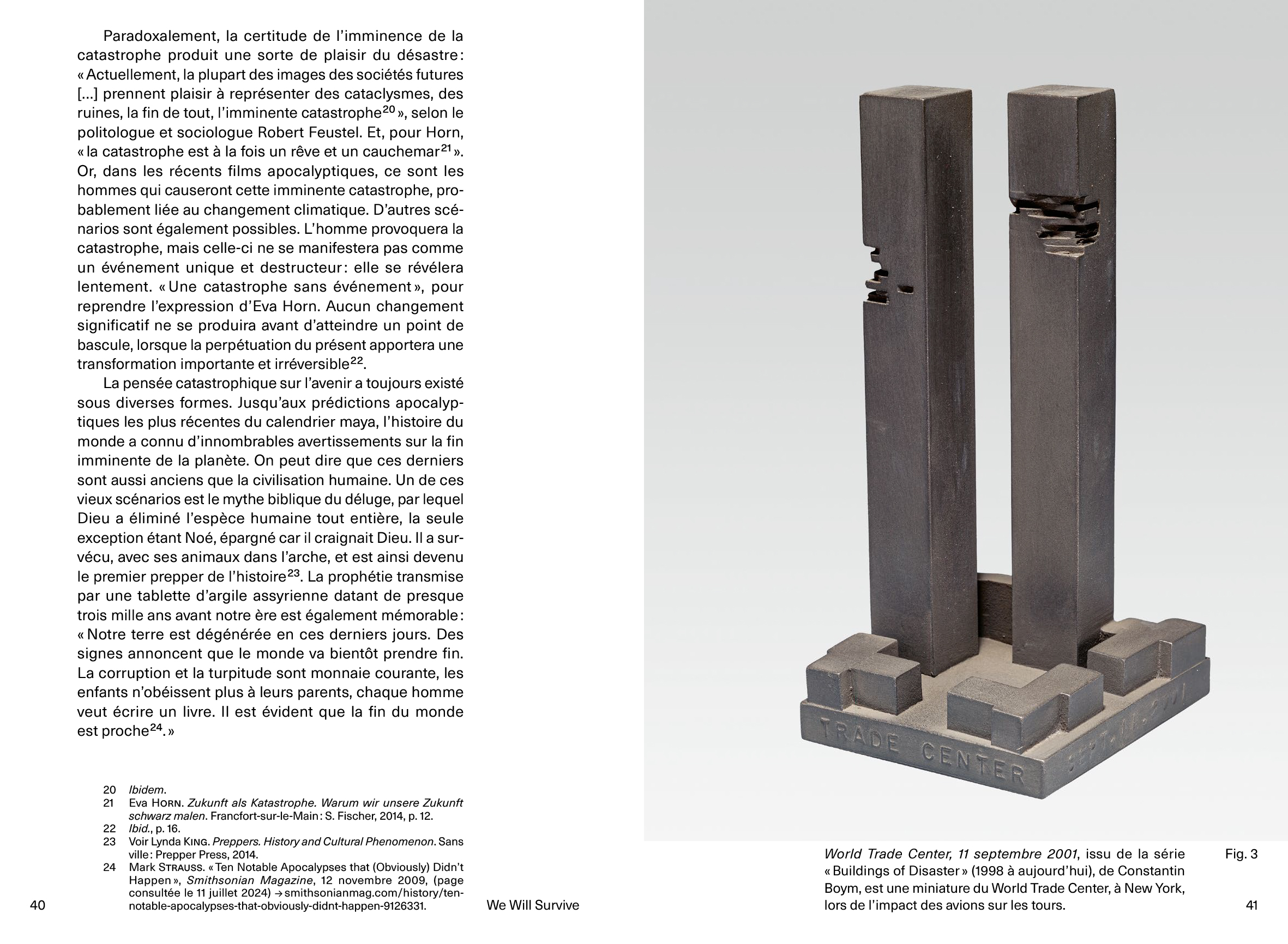We Will Survive rassemble les points de vue de théoriciens, de chercheurs, de concepteurs et de preppers. Il explore les chemins de la pensée, la philosophie, et les styles de vie variés d'un mouvement autrefois considéré comme marginal, aujourd'hui devenu un phénomène culturel dans le monde entier.