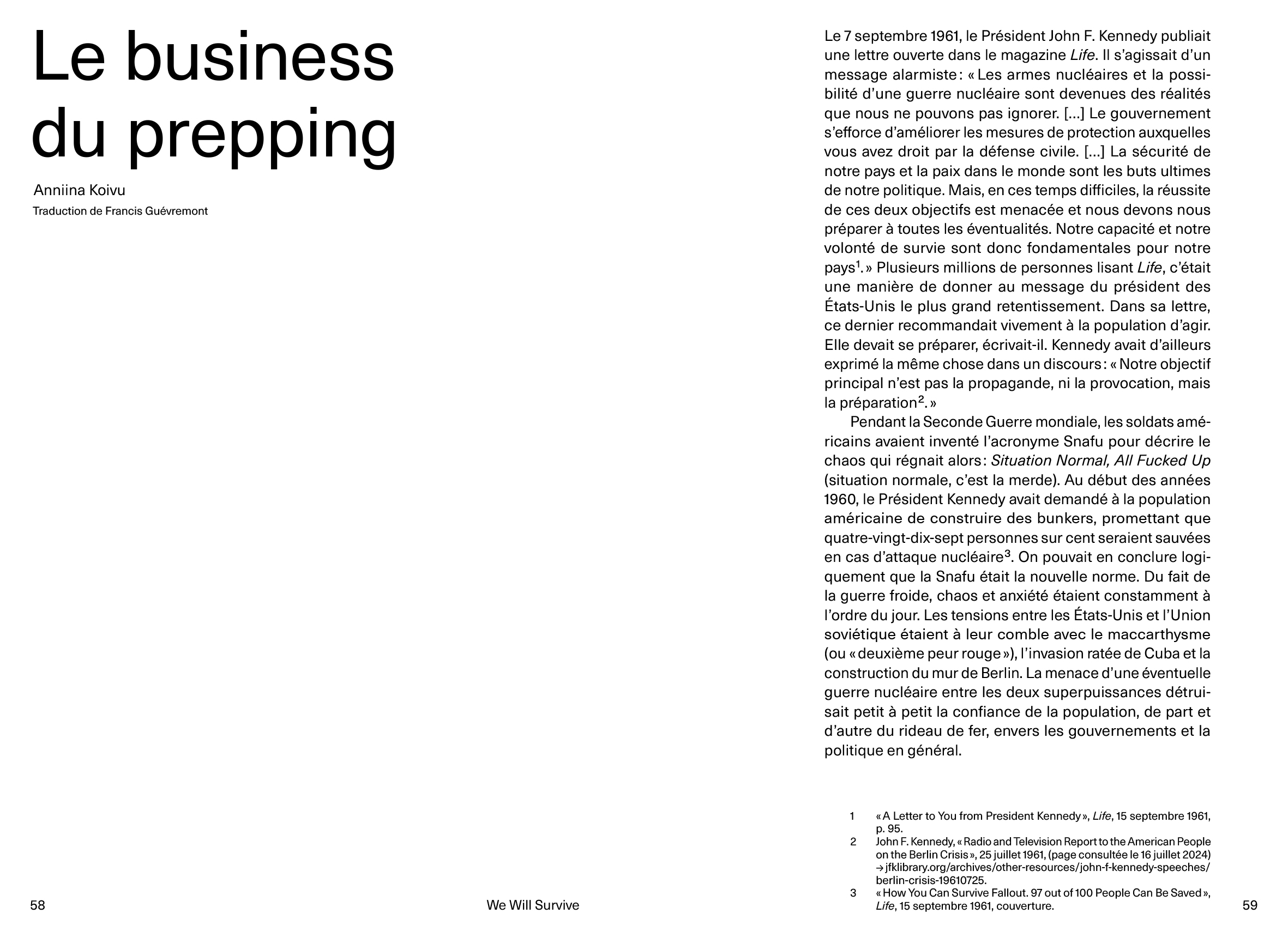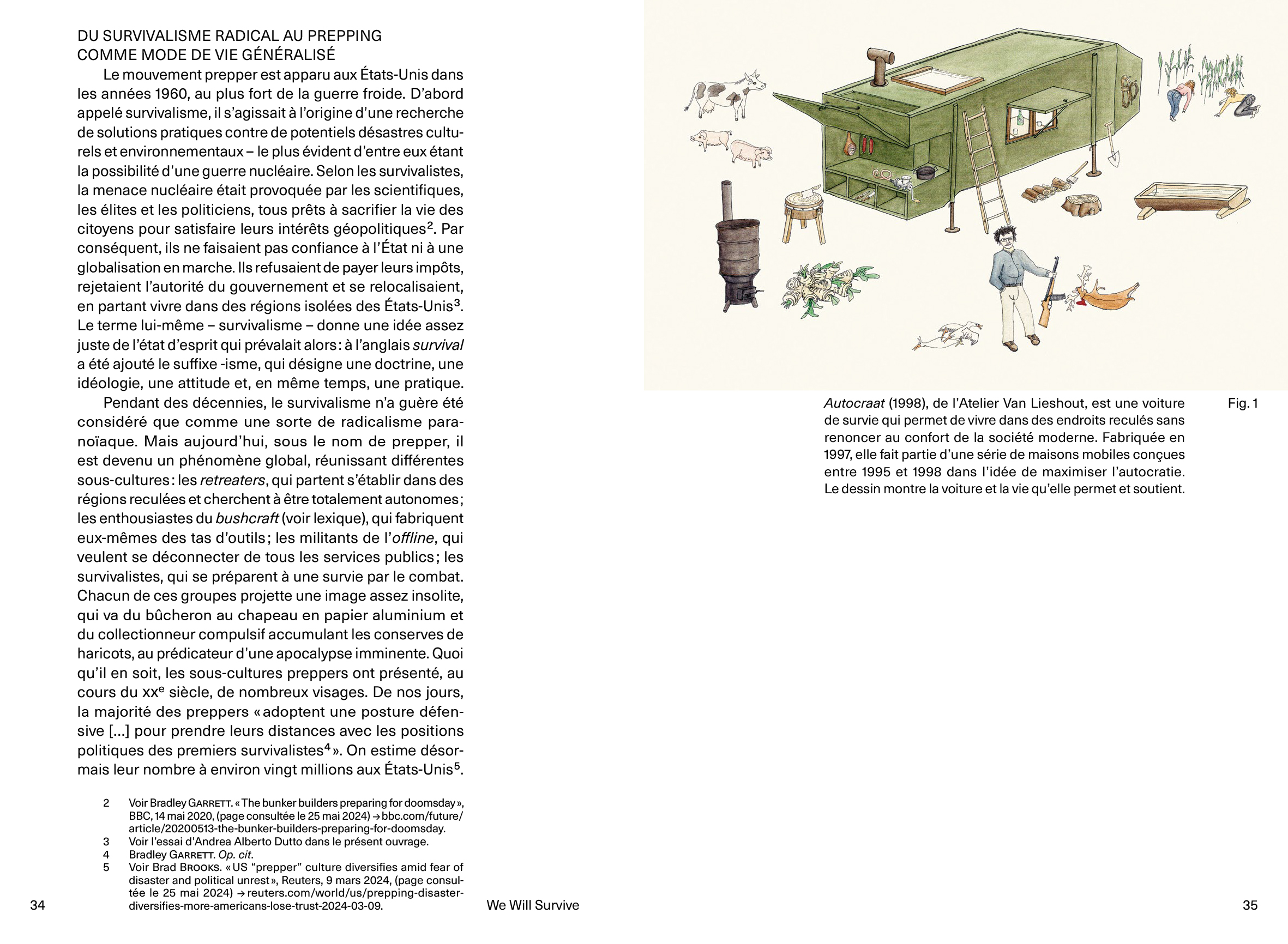 Une réflexion collective sur la capacité des objets et du design à contribuer à la survie et à la protection contre les désastres, à partir de l'examen du phénomène des « preppers ».