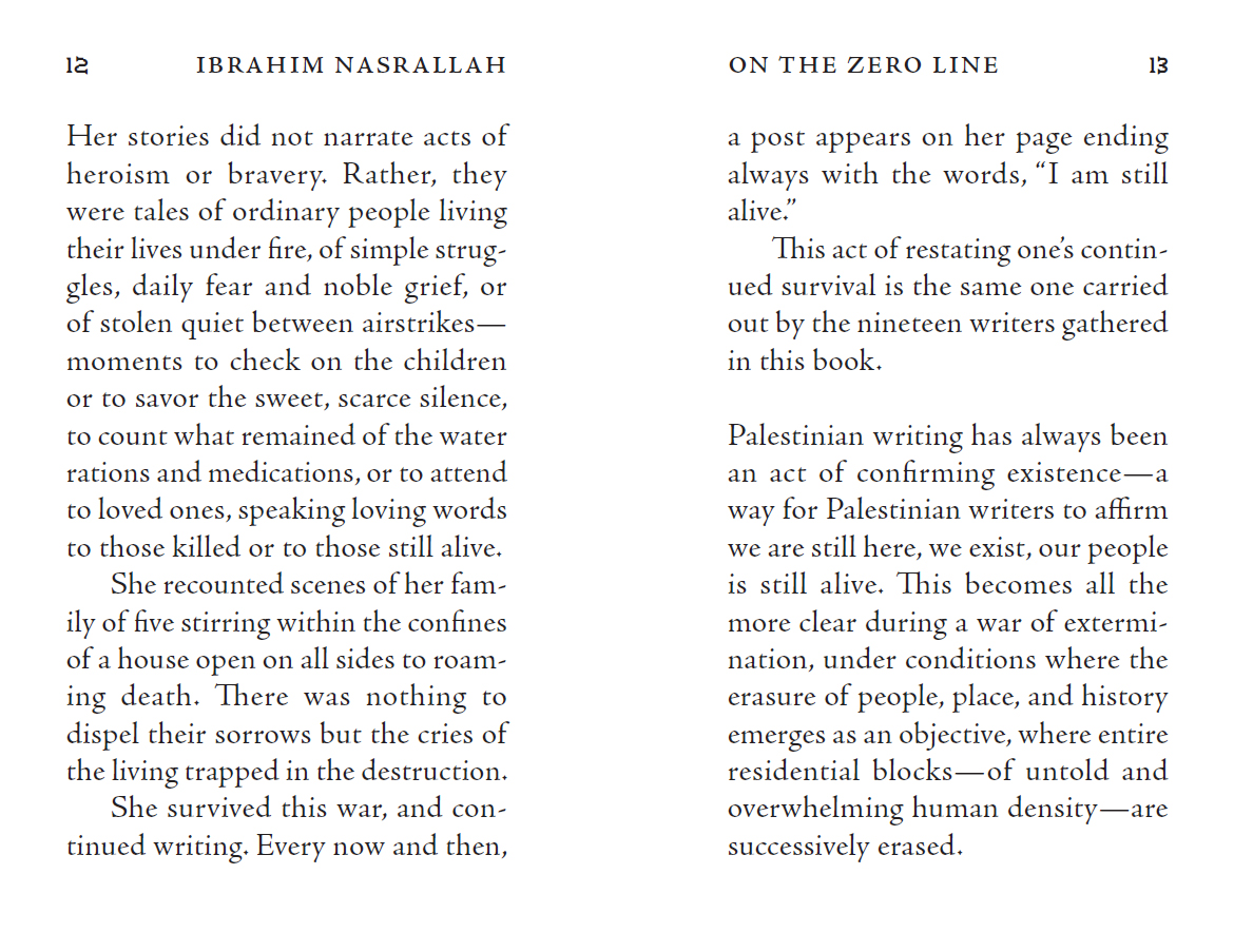 On the Zero Line est un recueil d'essais et de poèmes écrits au lendemain de l'invasion israélienne de Gaza en octobre 2023. Compte tenu de l'aggravation de la situation, depuis l'intensification de la famine à Gaza jusqu'aux nombreux civils abattus alors qu'ils cherchaient de la nourriture dans les points de distribution, on pourrait dire que ces textes sont « dépassés », et dans un certain sens, ils le sont ; un recueil d'écrits provenant de Gaza rédigé fin 2025 serait différent de celui-ci. Mais d'un autre côté, les textes inclus ici ne sont pas modifiés par l'évolution de la situation à Gaza, car ils traitent de questions et de thèmes qui remontent loin dans le passé et s'étendent loin dans l'avenir.