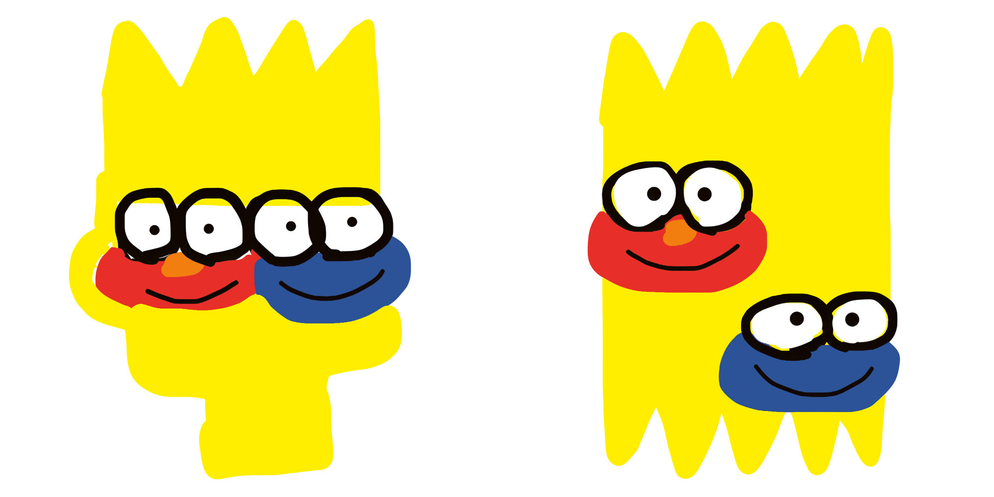 Les portraits déformés créés par Ken Kagami qui combine Bart Simpson avec les personnages de Sesame Street Elmo et Cookie Monster.