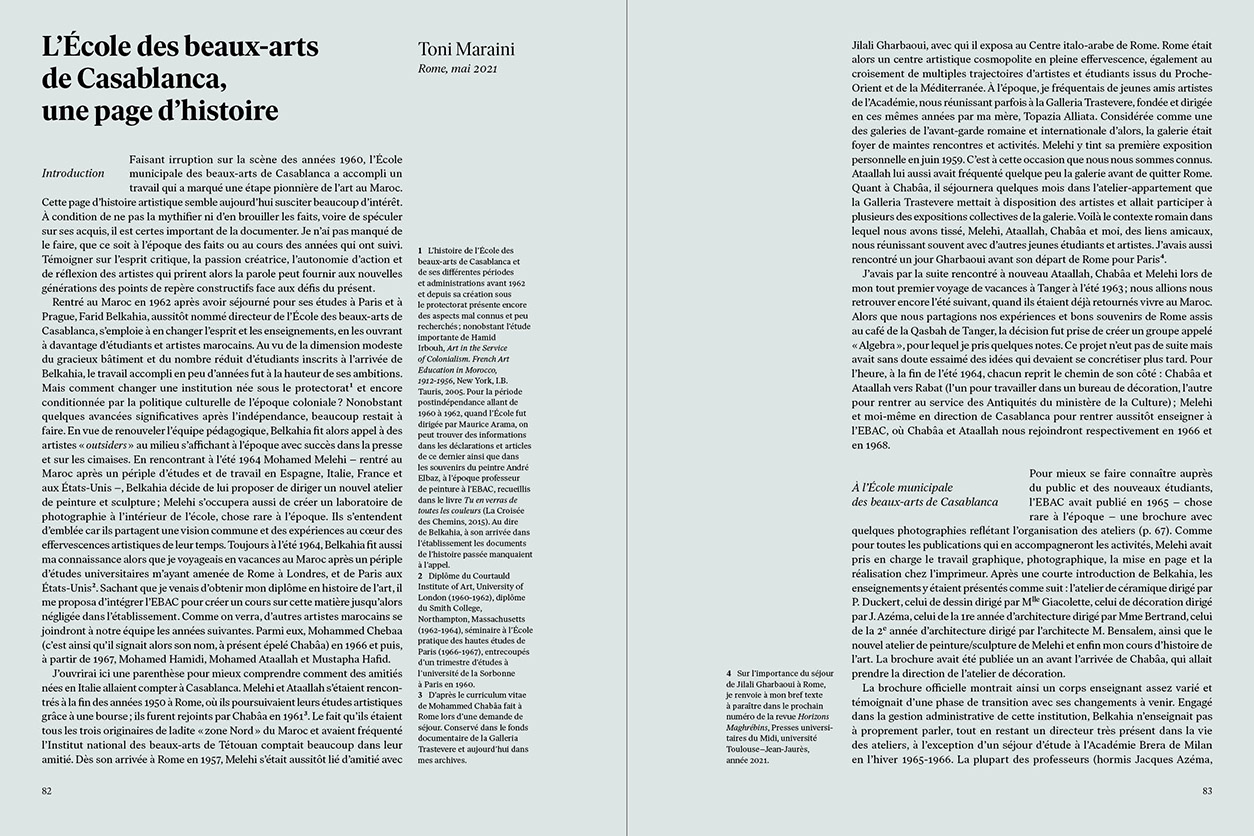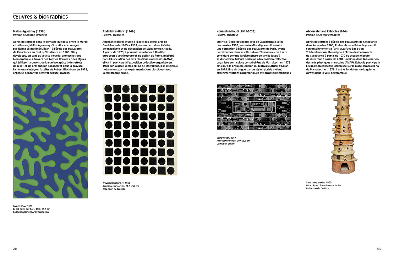 Bert Flint, Pauline de Mazières… Il rassemble un grand nombre d'auteur·rices impliqué·es dans l'écriture de l'histoire culturelle marocaine (Salma Lahlou, Léa Morin, Khalil M'Rabet, Katarzyna Pieprzak, Kenza Sefrioui…). À travers essais, archives et entretiens, cet ouvrage documente et analyse les activités et l'héritage de cette constellation d'artistes engagés dans plusieurs domaines complémentaires (peinture, photographie, fresque, arts appliqués, typographie, design graphique, scénographie) ; ainsi prendre la mesure de leur importance pour une histoire des arts postcoloniaux.