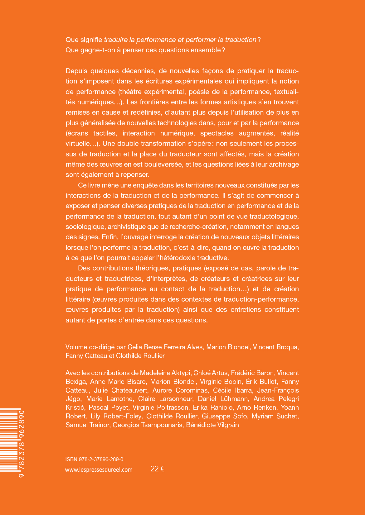 recherche-création, notamment en langues des signes. Enfin, l'ouvrage interroge la création de nouveaux objets littéraires lorsque l'on performe la traduction, c'est-à-dire, quand on ouvre la traduction à ce que l'on pourrait appeler l'hétérodoxie traductive.