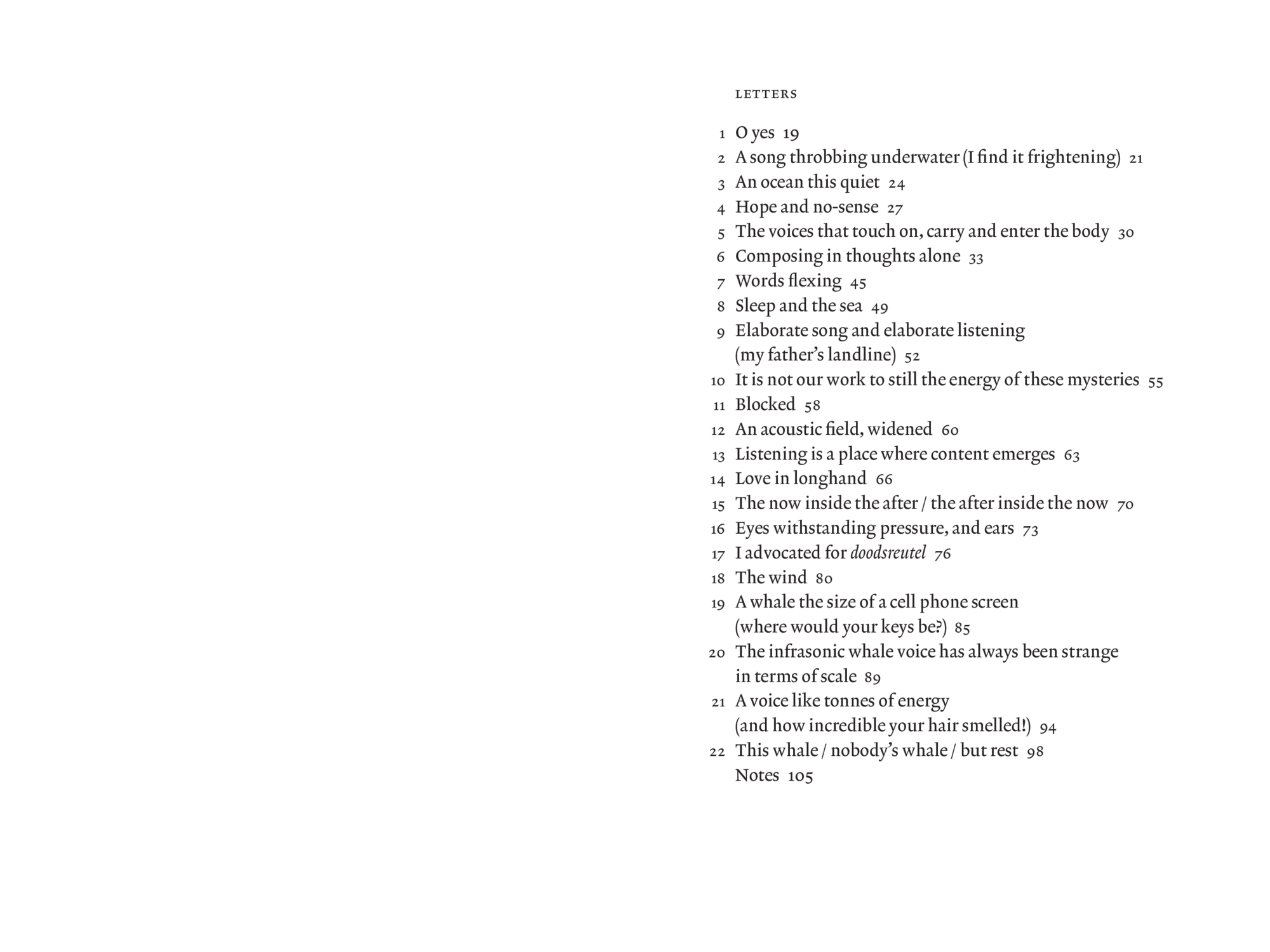 Moving through three years of call and response the book unfolds through "a joint meditation on the transformative potential of a note, a voice, carried from saltwater into the archive" (Rebecca Giggs).
