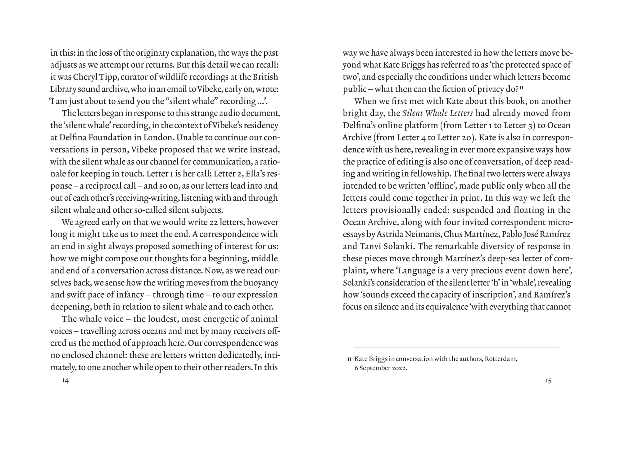 "In the space between these letters, I find a place for myself in the movement of the great silent or not-so-silent whale. Here is an ode to the liquid measure of listening, of carrying silence; letters finding each other through currents of migrating memories, shape shifting words, fluid thoughts, held with the same expansiveness as the silent whale. This exchange of only years feels like an ancient journey in feeling. I'm left pining for another letter."