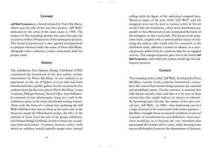 Jeff Wall Production began in 1988 as a title for Bal-Blanc's first critical text on the artist