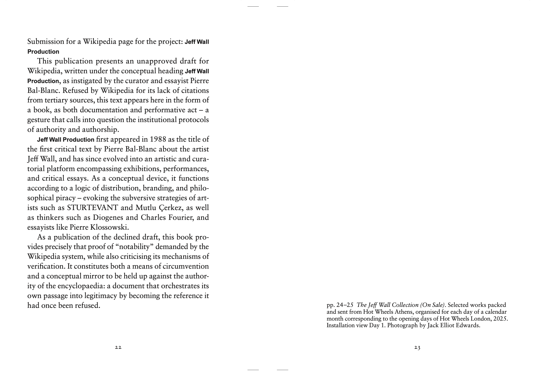 An unapproved Wikipedia draft authored under the conceptual label Jeff Wall Production, initiated by curator and essayist Pierre Bal-Blanc.