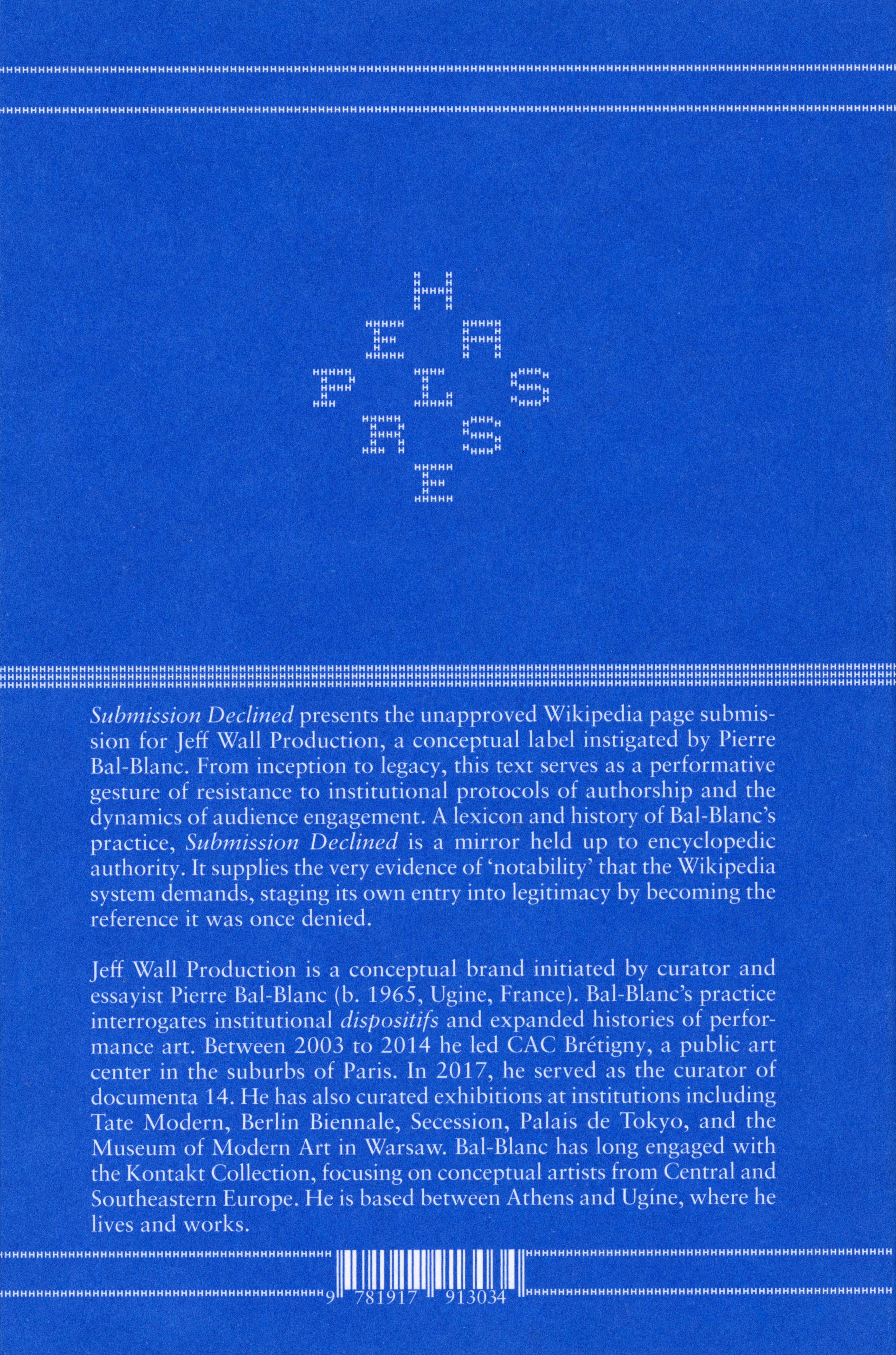 Currently declined by Wikipedia due to insufficient third-party citations, the text now returns in book form as both a documentation and a performative act—one that challenges the institutional protocols of authorship. By publishing this rejected draft, the book supplies the very evidence of "notability" that the Wikipedia system demands, while simultaneously critiquing the mechanisms of citation and verification. It is both a workaround and a conceptual mirror held up to encyclopedic authority—a document that stages its own entry into legitimacy by becoming the reference it was once denied.