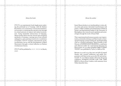 Pivot moves beyond historical narrative, scrutinizing this epochal event through its pivotal moments—critical junctures of rupture and radical reorientation. Mason Jordan masterfully employs repetition, metaphor, and other minimalist abstractions of language to delve into the visceral and conceptual mechanics of turning: a turning away from colonial subjugation, a turning towards new vocabularies of freedom, and the cyclical turning of memory. Through linguistic architectures and etymology, akin to the likes of