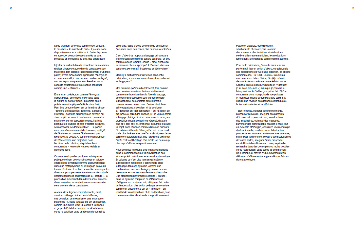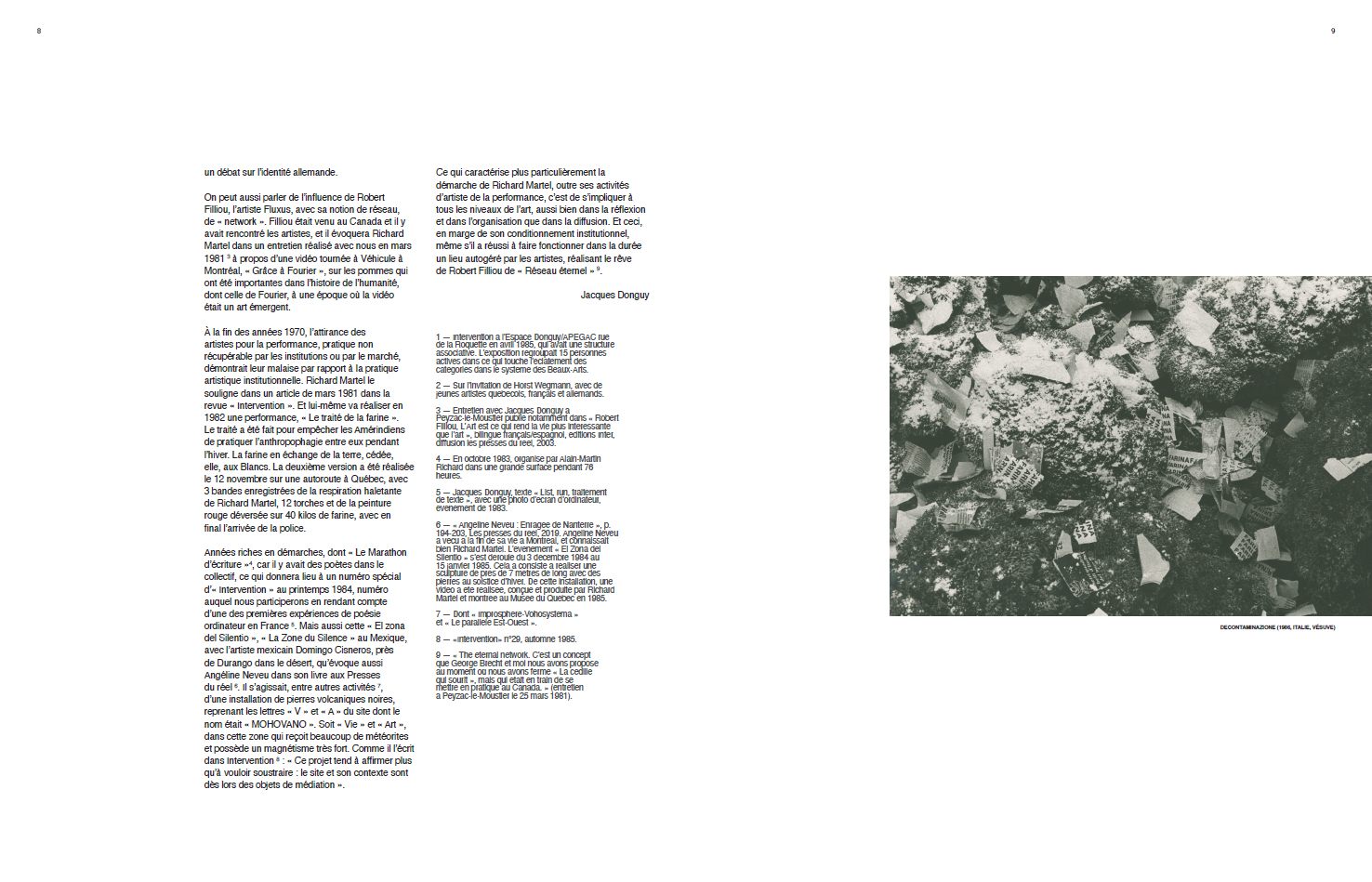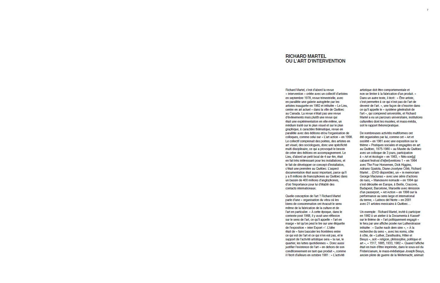 Richard Martel (born 1950 in Québec) is a producer and destabilizer. He writes, performs, creates installations and video art, and oversees the promotion, organization and dissemination of art in his role at Le Lieu, centre en art actuel and the magazine Inter, art actuel. He has presented over 240 performances in more than 40 countries.
