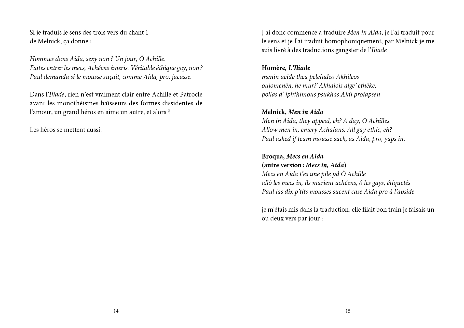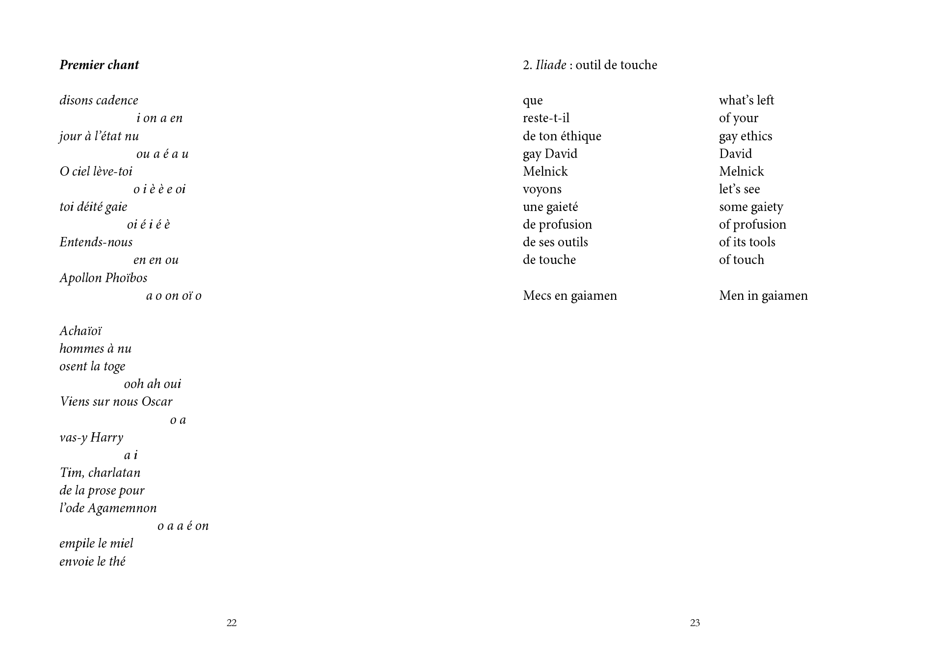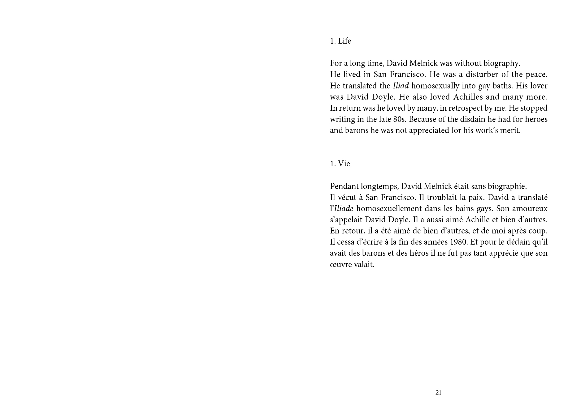 Vincent Broqua twists translation to vandalize literary classics in a sensual act, and expresses the wish for a gay ethic for our time. Queer beings are inventing alternative ways of holding their bodies together: Vincent Broqua expresses the wish for a gay ethic for our time.