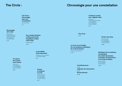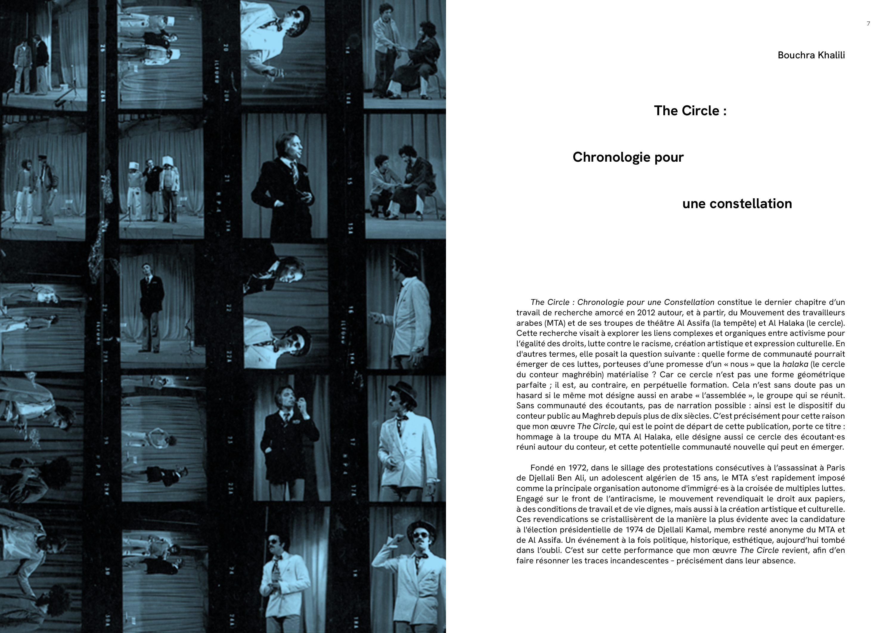 Khalili focused her attention on the theatre groups Al Assifa and Al Halaka who were created in this political environment. The publication unfolds from The Circle (2023), a video installation shown for the first time at the 15th Sharjah Biennale (2023), at Macba (2023) and at the Luma Foundation (in Arles in 2023-2024 and Zurich in 2025).