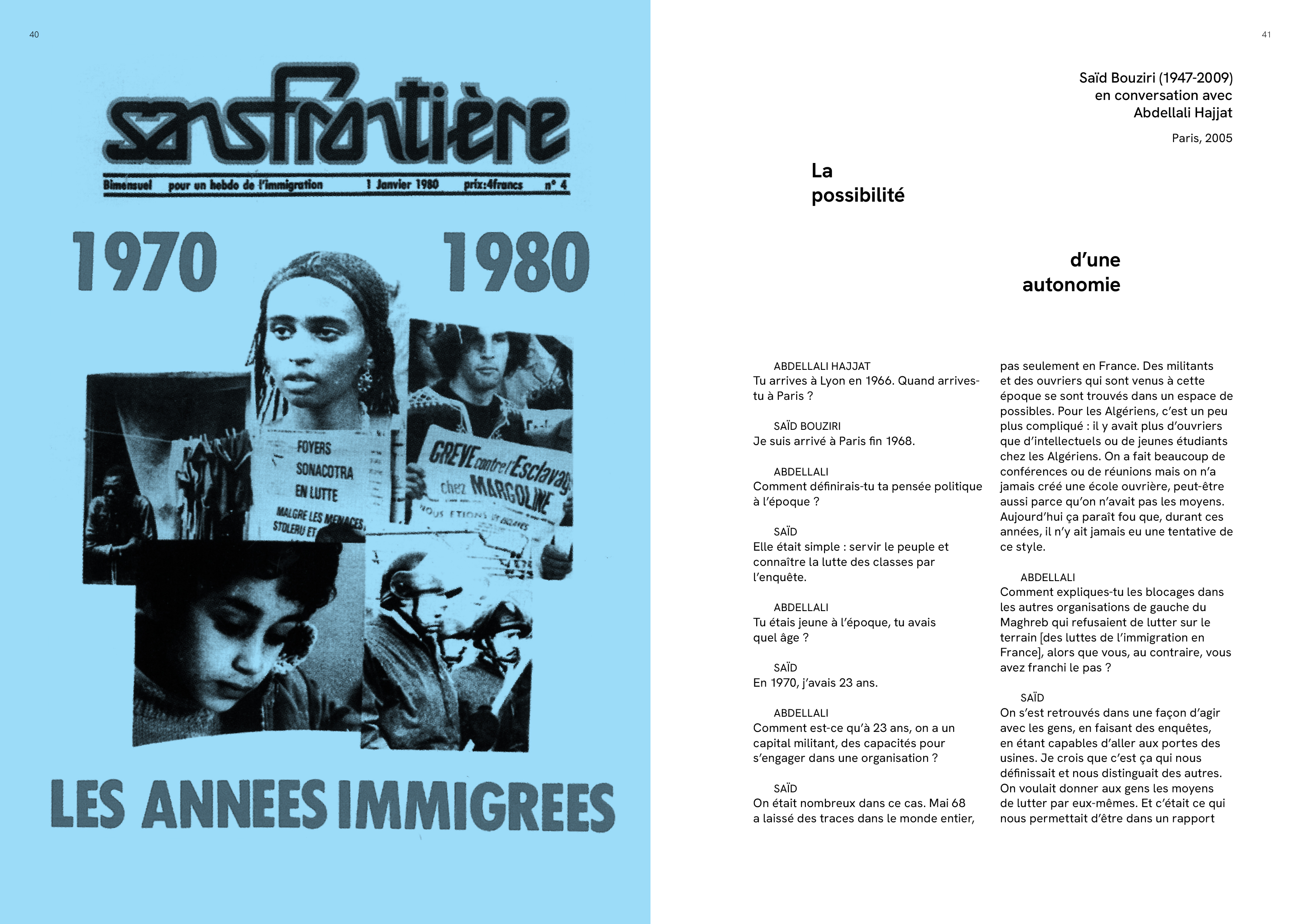 A visual and text based investigation led by Moroccan artist Bouchra Khalili during many years following the traces left by the Mouvement des travailleurs arabes, a group fighting for the rights of the Arab workers in France at the turn of the 1970s.