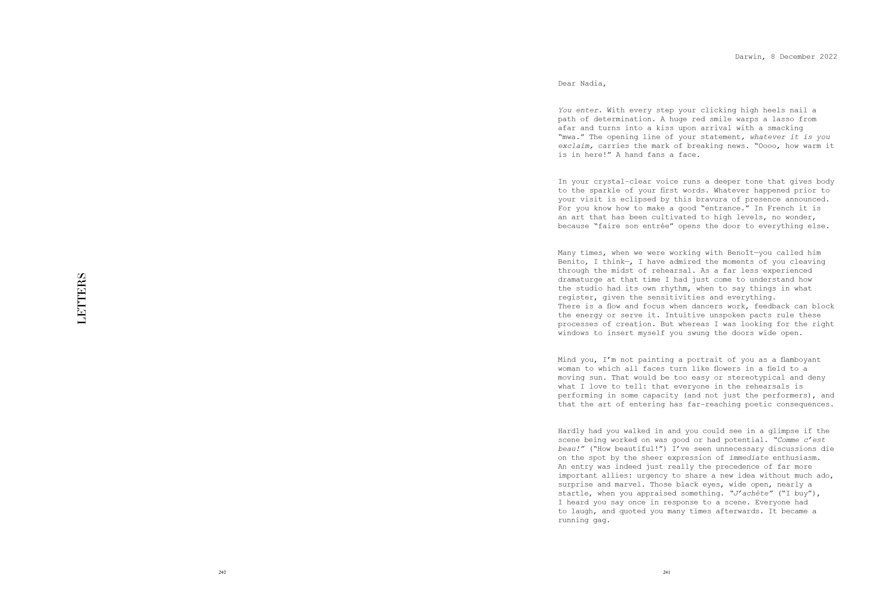 Nadia Lauro has collaborated with the following international choreographers and performers: Vera Mantero, Benoît Lachambre,