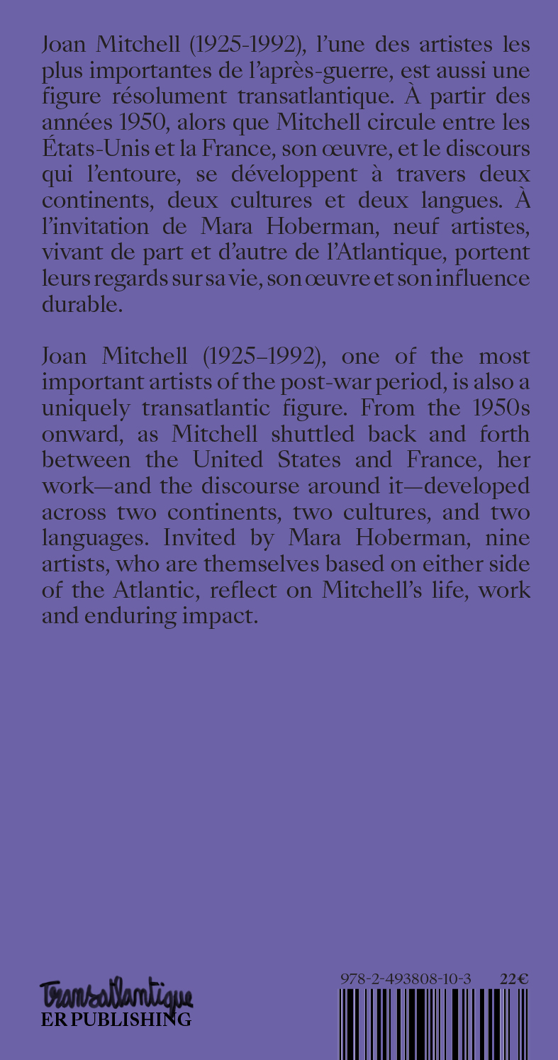 Joan Mitchell (1925–1992), one of the most important artists of the post-war period, is also a uniquely transatlantic figure. From the 1950s onward, as Mitchell shuttled back and forth between the United States and France, her work—and the discourse around it—developed across two continents, two cultures, and two languages. Invited by Mara Hoberman, nine artists, who are themselves based on either side of the Atlantic, reflect on Mitchell's life, work and enduring impact.
