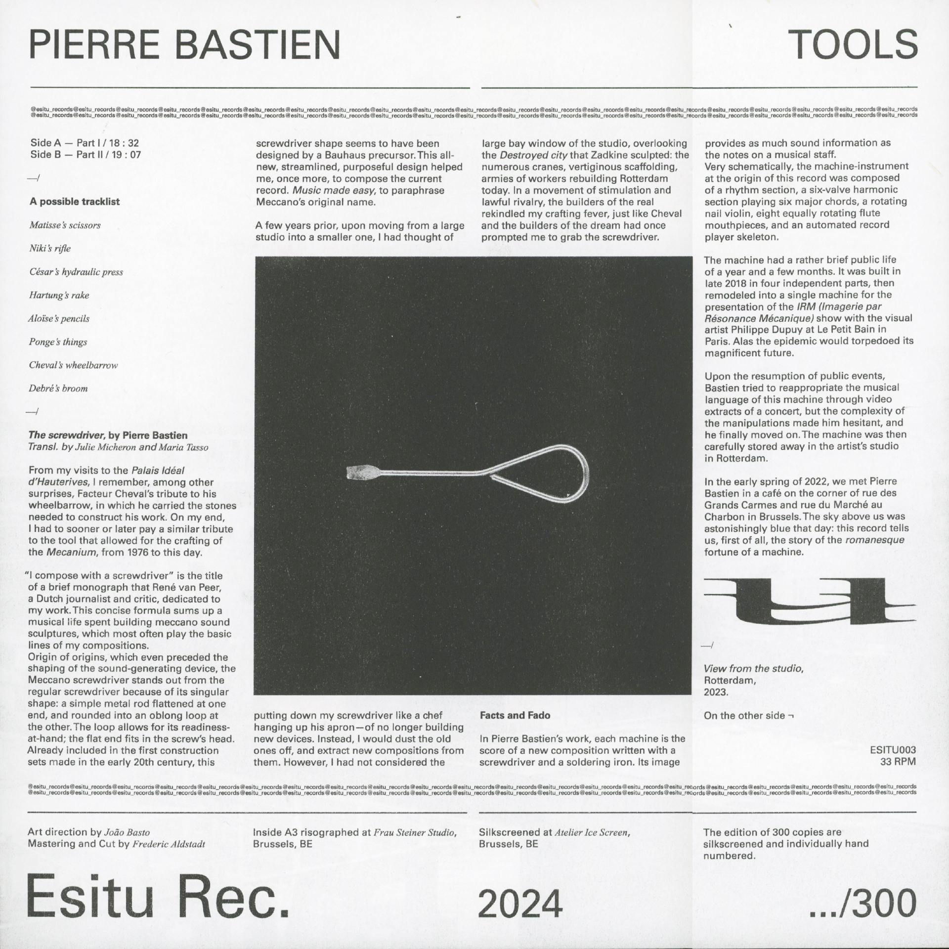With Tools, Pierre Bastien deepens his lifelong fascination with the idea of "elsewhere". The title nods to a text by René Van Peer, "I compose with a screwdriver", evoking the humble tool that has shaped Bastien's mechanical music since 1976. Performing on assemblages built from Meccano parts, Bastien invites us first to observe its raw mechanics: the clash of gears, the hum of rotation, the tension between precision and accident.