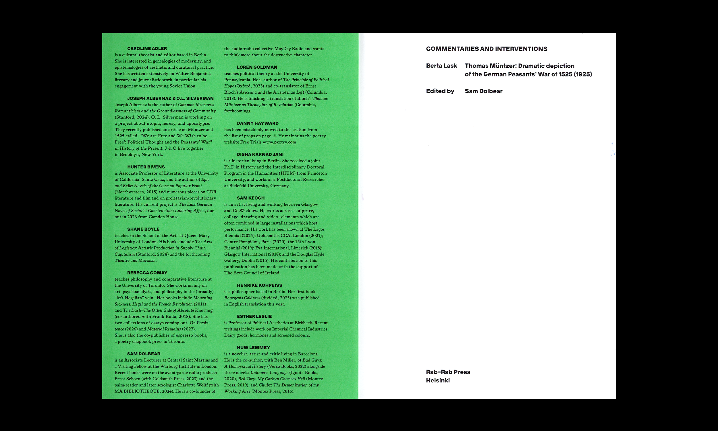 For the first time, Lask's play has been translated for a print edition alongside a set of commentaries and interventions: on everything from the "prolatarian problem play" to rainbows and bundles of twigs; from Albrecht Dürer's monument to the slain peasants to Paul Robeson's rendition of "Joe Hill"; from revolutionary violence to tragic commemoration.