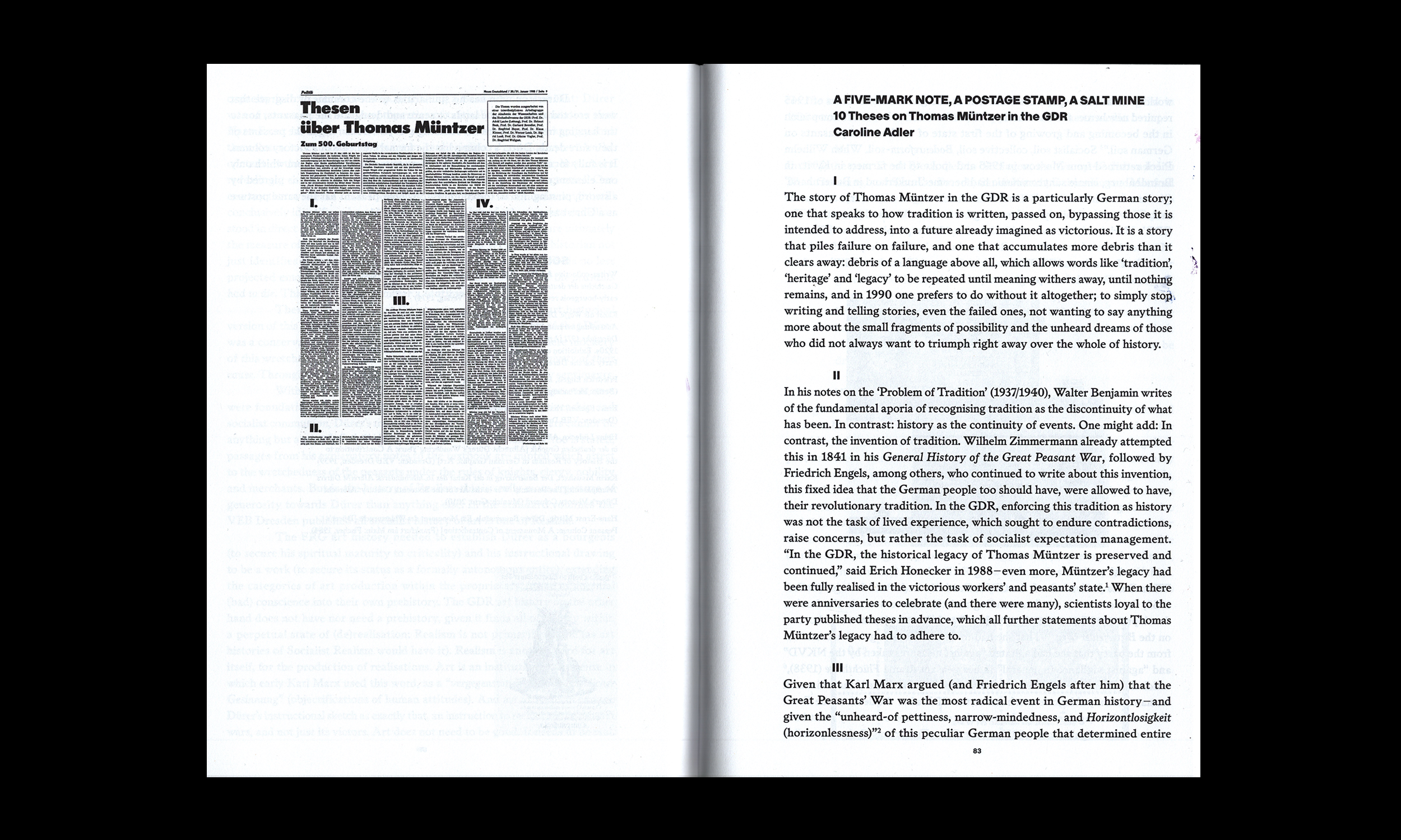 In the play, Lask poses a basic question: What would Thomas Müntzer see if he woke up today? A list accrues: Climate breakdown, imperialism, gendered oppression, earthquakes, genocide, impending fascism. Capitalism didn't dig its own grave. Rather, the dead oppressors of previous centuries have been resurrected, planted in new bodies, tooled with new modes of bondage, within uneven spatial domination and temporal disjunction. Thomas Müntzer, with all of its time travel and its modes of resurrection, addresses the present from a past multiplied.