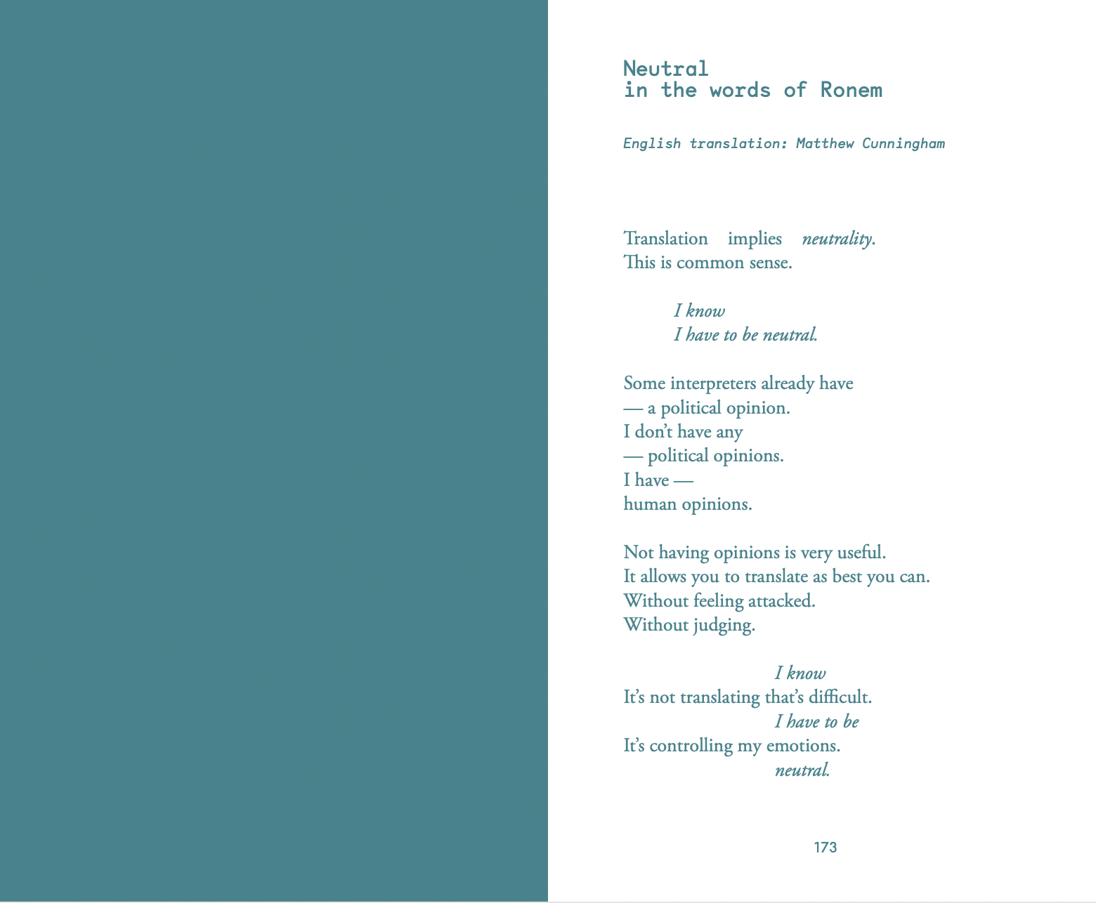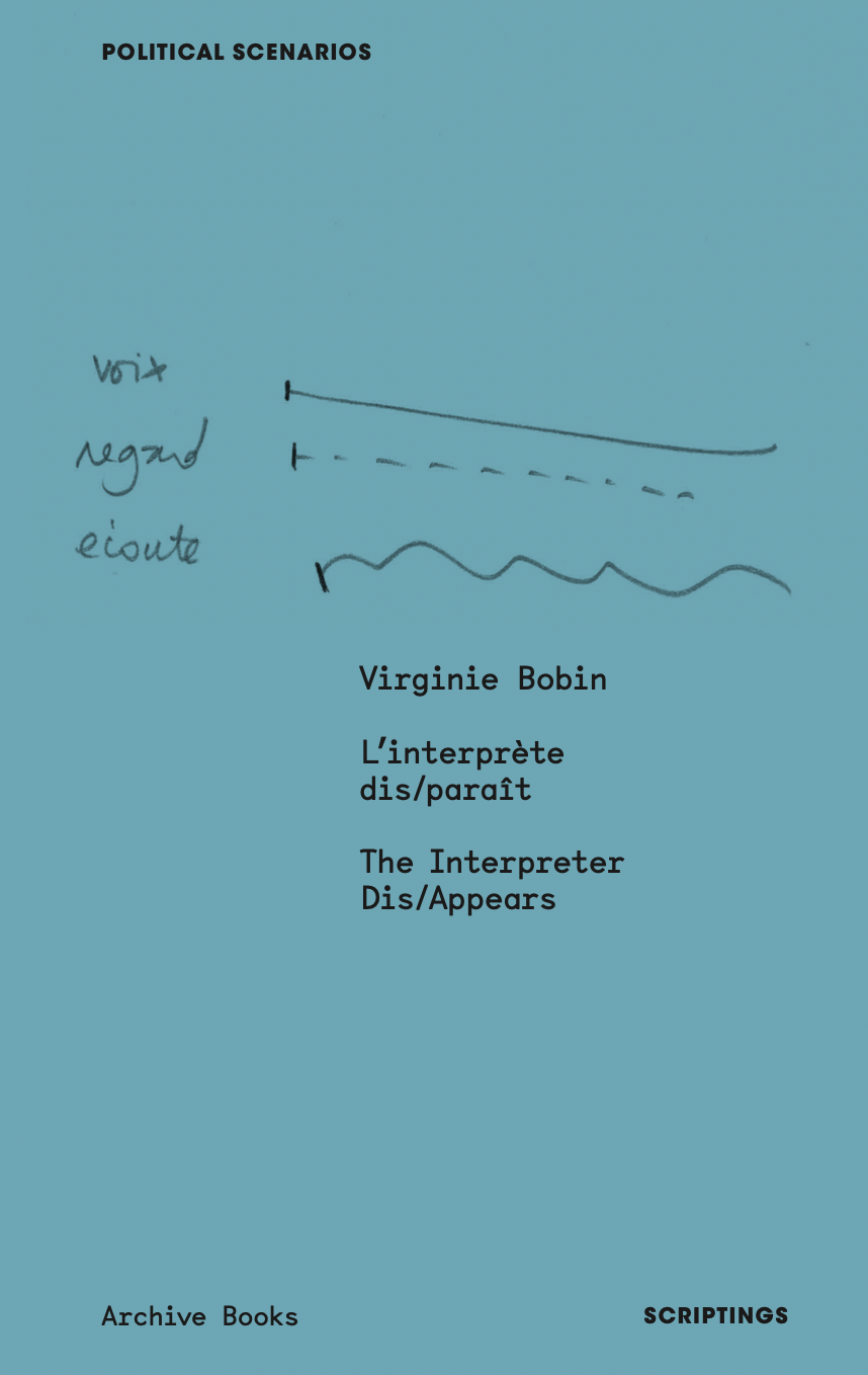 The Interpreter Dis/appears stems from an investigation conducted between 2019 and 2023 by curator, editor, and translator Virginie Bobin, focusing on both professional and volunteer interpreters and translators, as well as representatives from the state and organizations working with exiled individuals navigating asylum application procedures in France. By redirecting attention to the voices of interpreters—rarely visible figures in this ecosystem—the project delves into the ambiguous role of translation at the intersection of those who govern and those governed by asylum law. Within such a controlled environment, can the act of translation, with all its complexities, still express fleeting gestures of solidarity or even resistance? Through the exchanges prompted by these questions, the book seeks to reframe the prevailing public and political discourse on asylum, harnessing the embodied experiences of a small group of interpreters as an alternative lens to reveal the underlying power dynamics at play. It also probes the ethical and political potential of translation. The Interpreter Dis/appears unfolds across a variety of theatrical, artistic, and theoretical writing, alongside insightful contributions from artists and researchers who open up different perspectives for understanding and activating these issues.