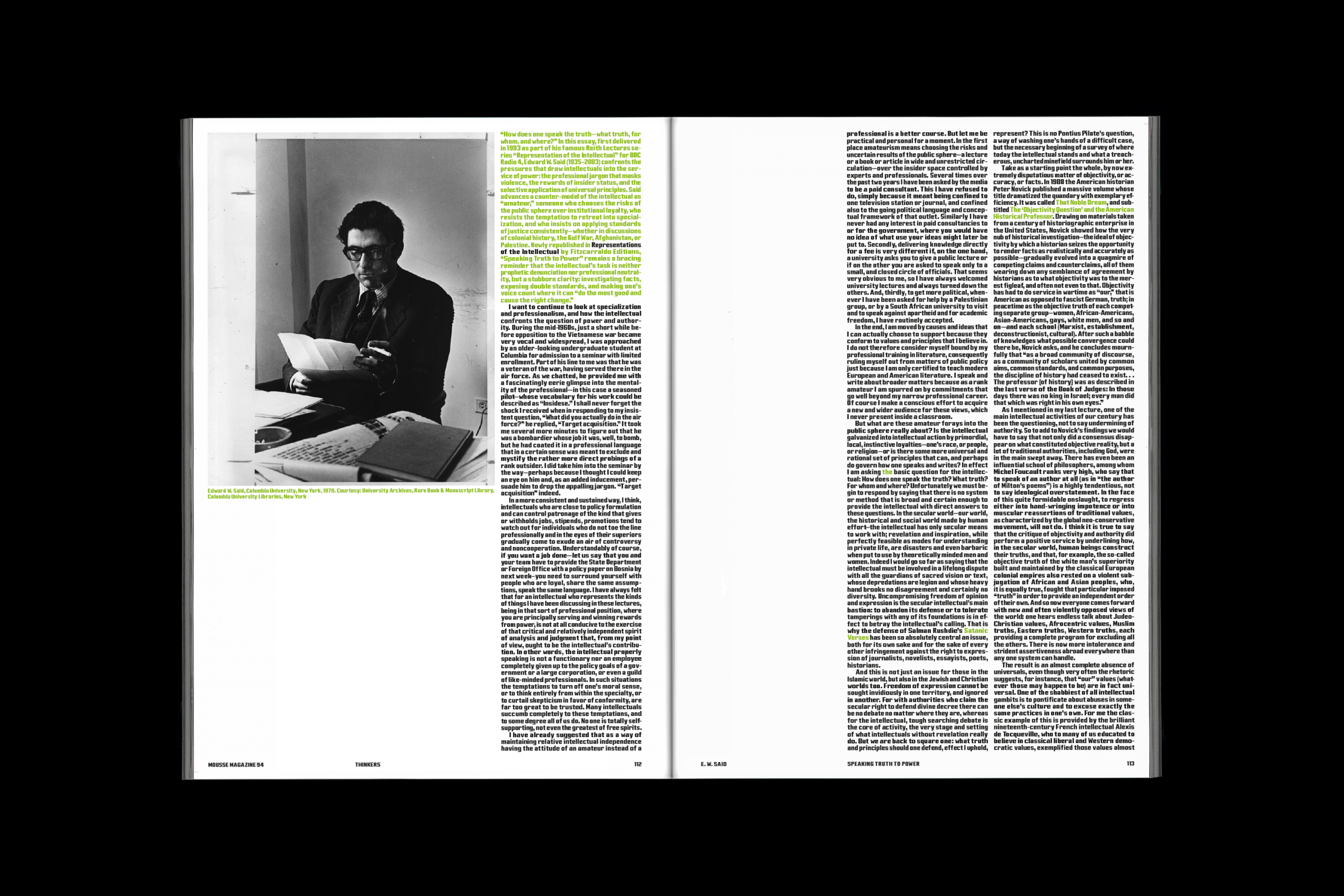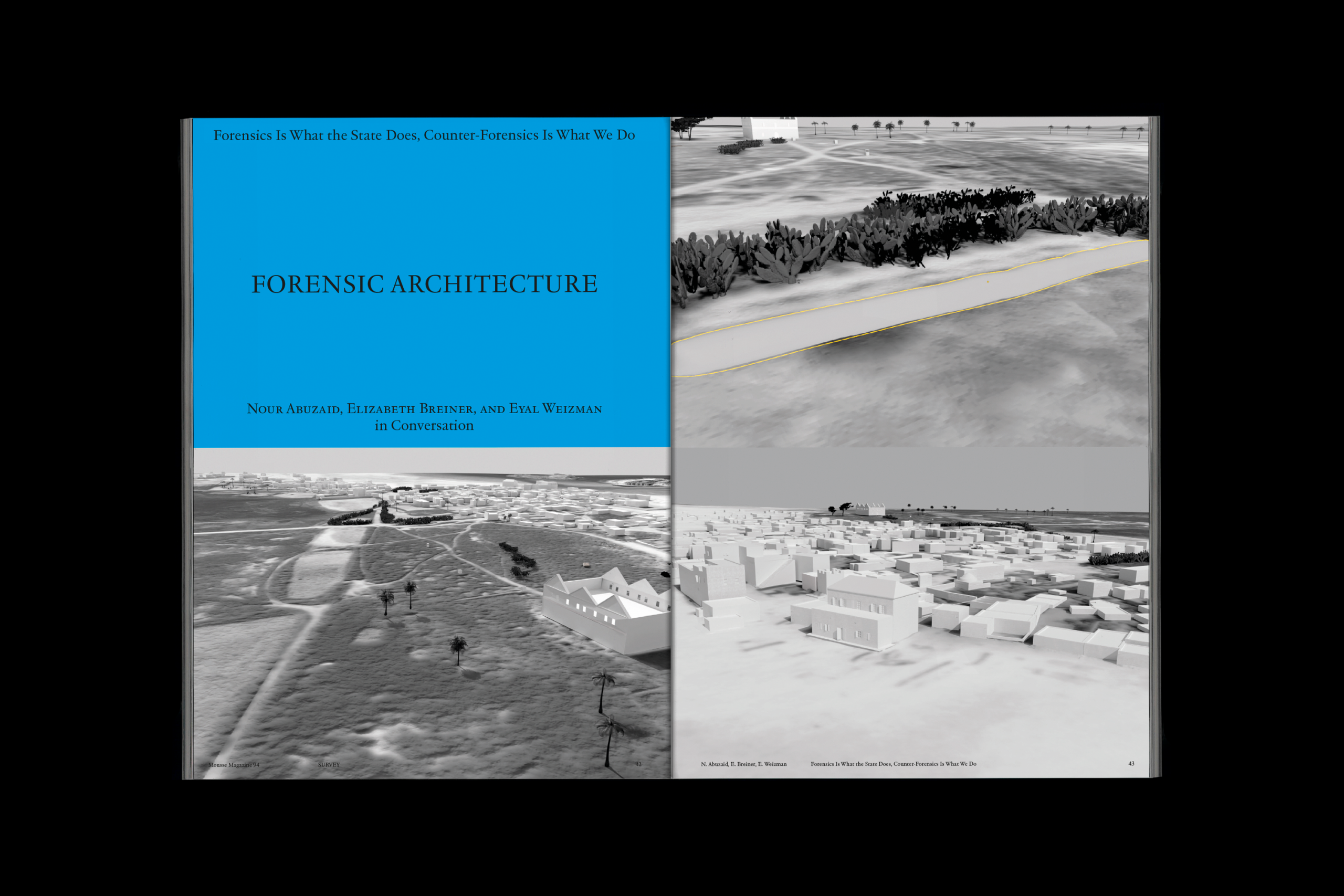 Forensic Architecture's Eyal Weizman speaks of new ways of detecting "hyper-relations" as strategies to confront systemic violence. Edward W. Said, in his crucial 1993 essay "Speaking Truth to Power" (reprinted here), argues that "the intellectual's voice is lonely, but it has resonance because it associates itself freely with [. . .] the common pursuit of a shared ideal." And in our Curators section, Shumon Basar memetically reaffirms that now more than ever, "Comment is king."