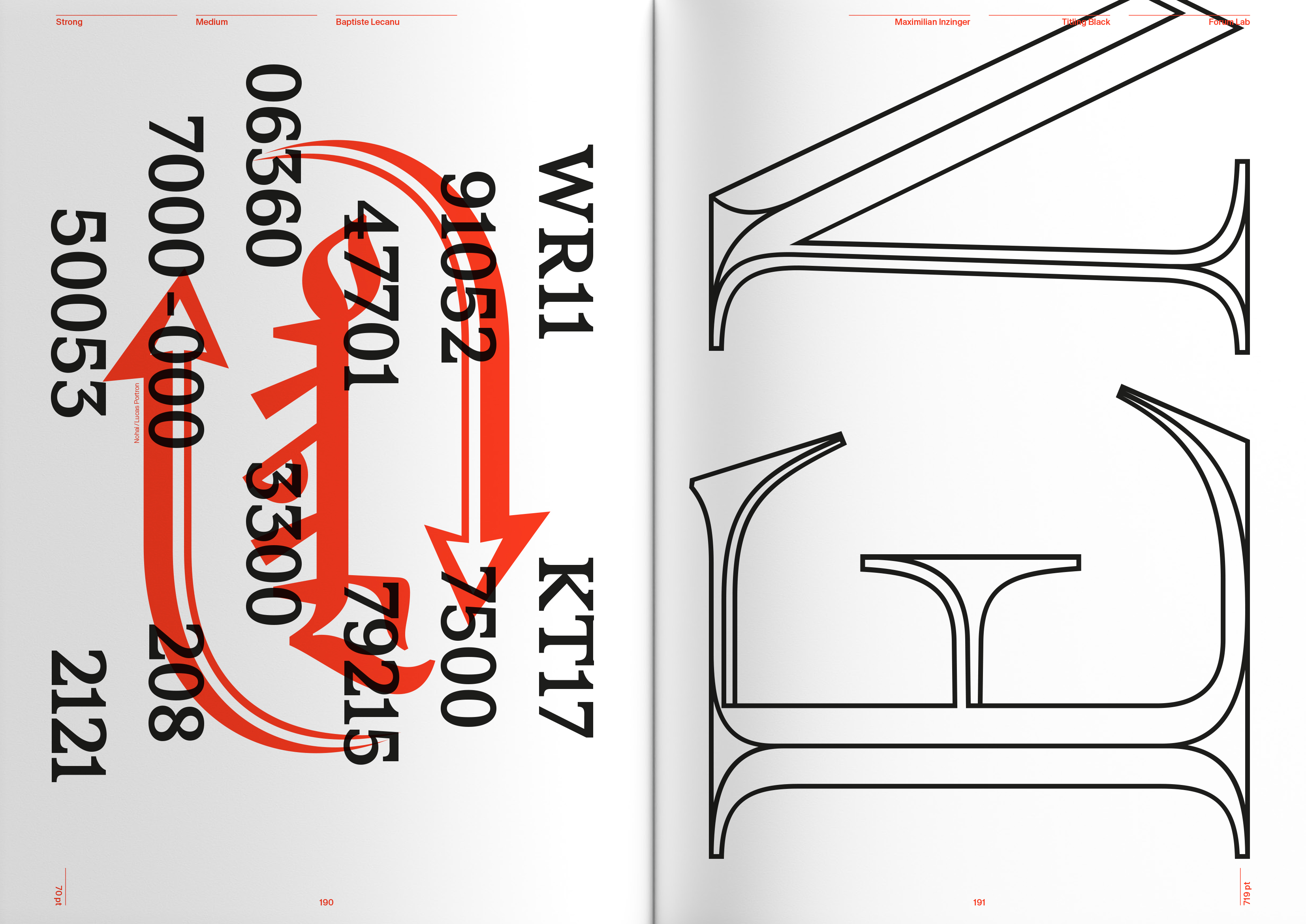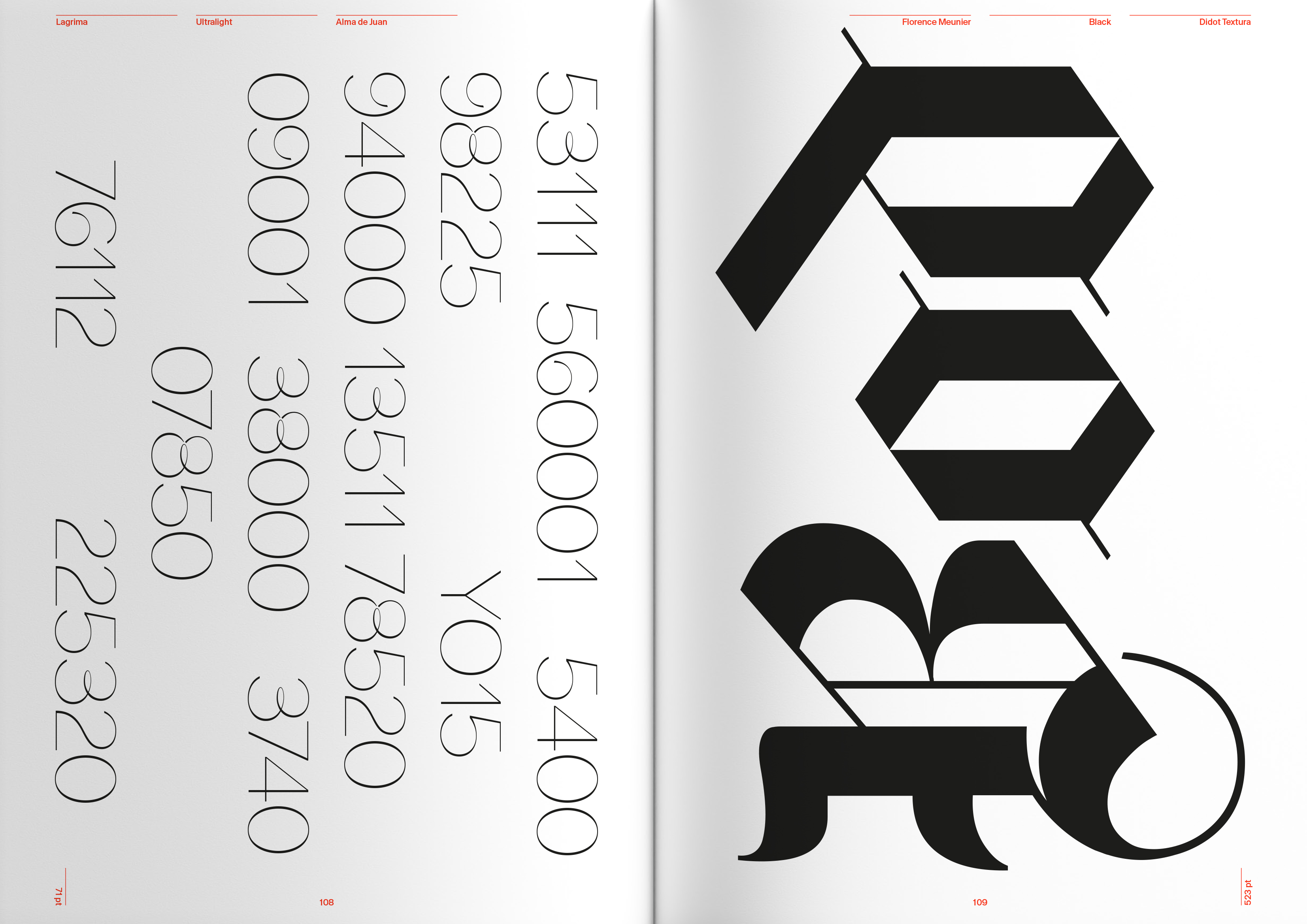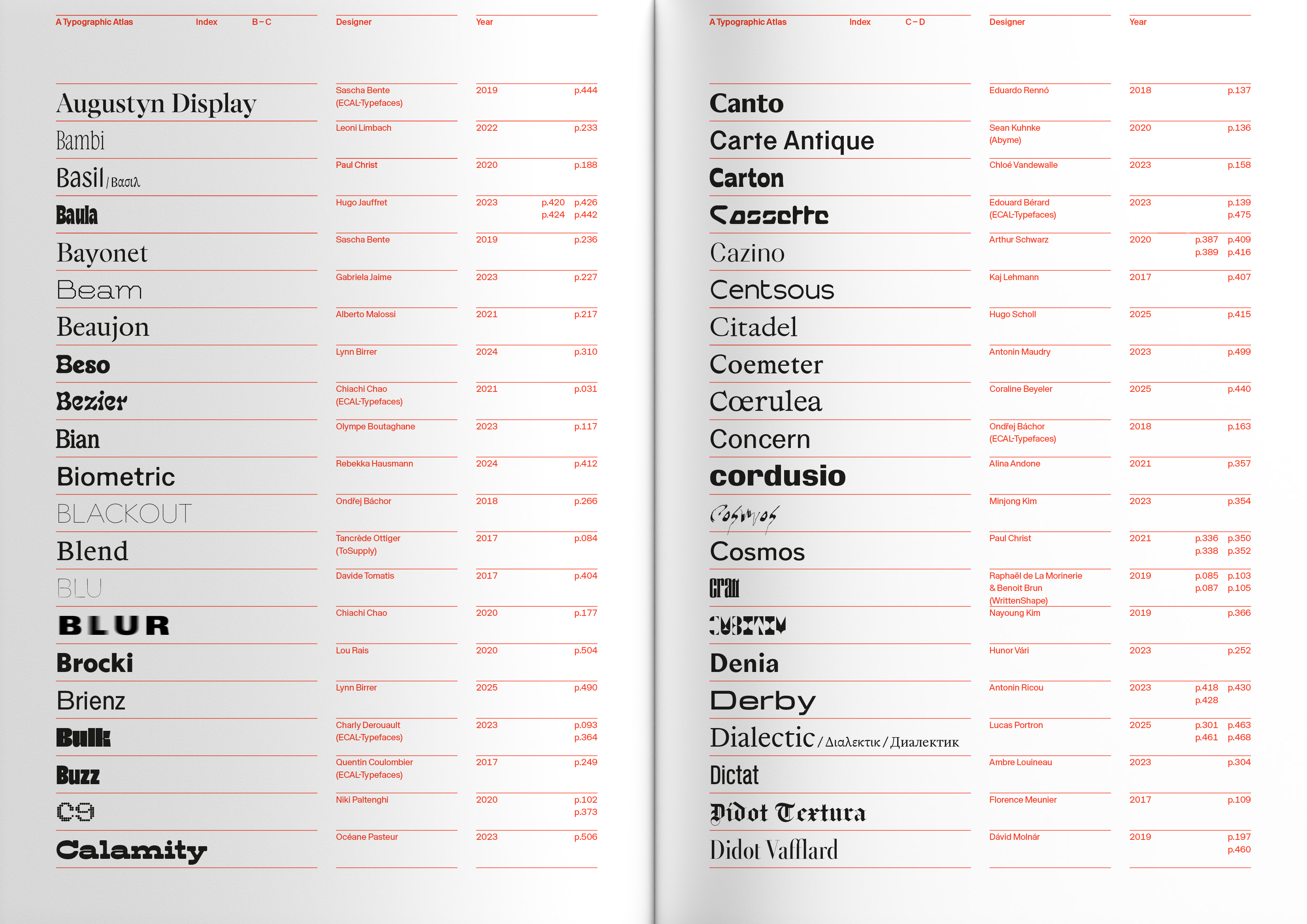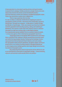 typographic creation at ECAL / University of Art and Design Lausanne, Switzerland. Through two programs—its Bachelor in Graphic Design and Master in Type Design—ECAL has trained more than four hundred students graduates in the drawing, spacing, coding, and mastering of letterforms. The result is a wide map: from classical, easy-to-read text intended for small-size running copy, to wild display shapes; from experimental, barely readable forms to revisited classical models—across every genre of the contemporary typographic spectrum.