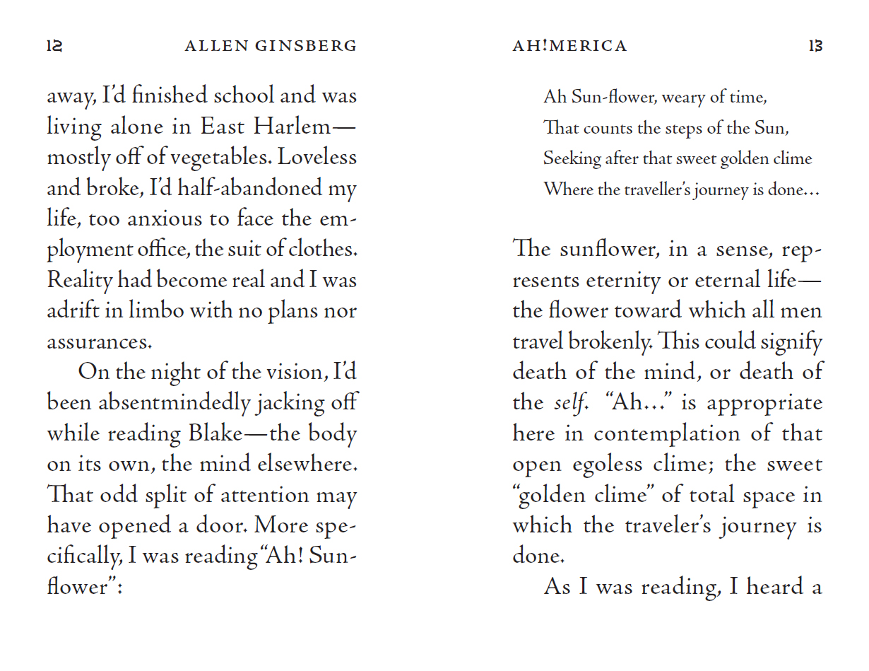 Taking its title from Blake's "Ah! Sunflower," AH!MERICA develops a poetics of attention: the line as breath, the "somatic rhythm" a poem can transmit, and the force of "minute particulars." Look hard at what everyone else has trained themselves not to notice. Cornices on nineteenth-century apartment buildings, rivet-heads on subway pillars, the "fat black fungus" of chewing gum on a platform: the overlooked textures of daily life become the raw material of American writing, and a way to test perception against habit.
