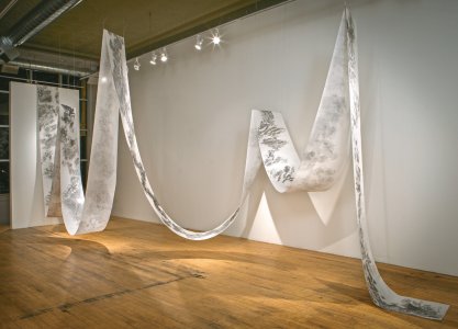 Her work is grounded in the gestural tradition of 20th-century art, drawing from Eastern artistic sources. The calligraphic tension, sustained exercises with patterns, and the disciplining of instinct in her drawings resonate with the forms of traditional Chinese drawing. Her visual pieces, charged with mental energy, resist translation into language and suggest delicate, self-contained worlds into which viewers are invited to immerse themselves. This has led her to experiment with unconventional formats, incorporating scrolls as exhibition devices and rice paper as her chosen surface. These formats, widely used in Buddhist cultures, require the viewer to engage in intimate proximity with the work—calling for a fragmented and detailed observation, and a gaze capable of following the forms as they expand, contract, or disappear.