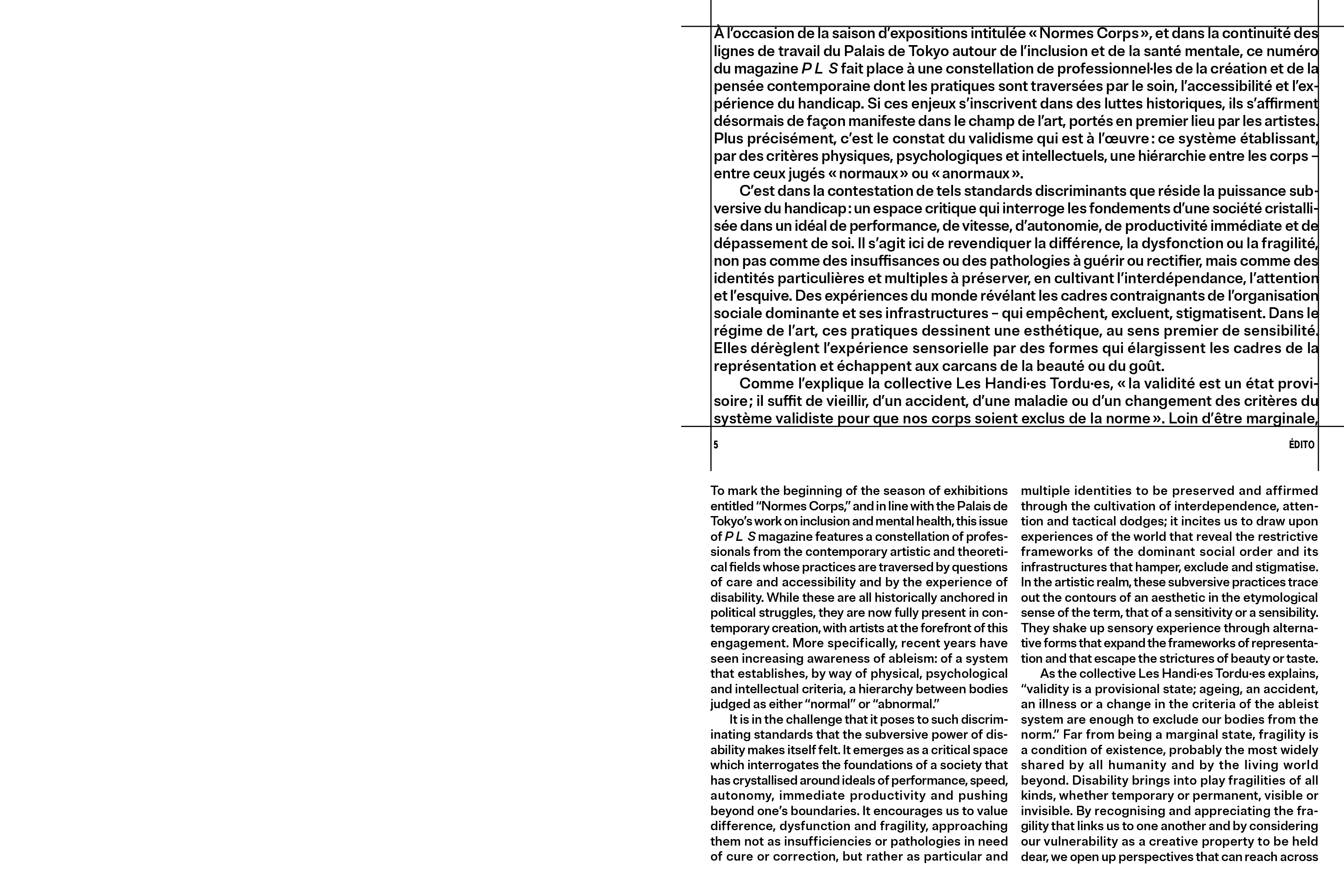 Published twice a year, Palais magazine (P L S since 2023) offers an in-depth perspective on the exhibitions and program of the Palais de Tokyo. Palais allows people to see contemporary art in a topical way, as often as possible from the point of view of the artists themselves. Each issue of the magazine includes dossiers, interviews, essays, special projects and inserts, all contributed by artists, art critics, historians or theorists, making Palais magazine an essential tool for apprehending contemporary art.