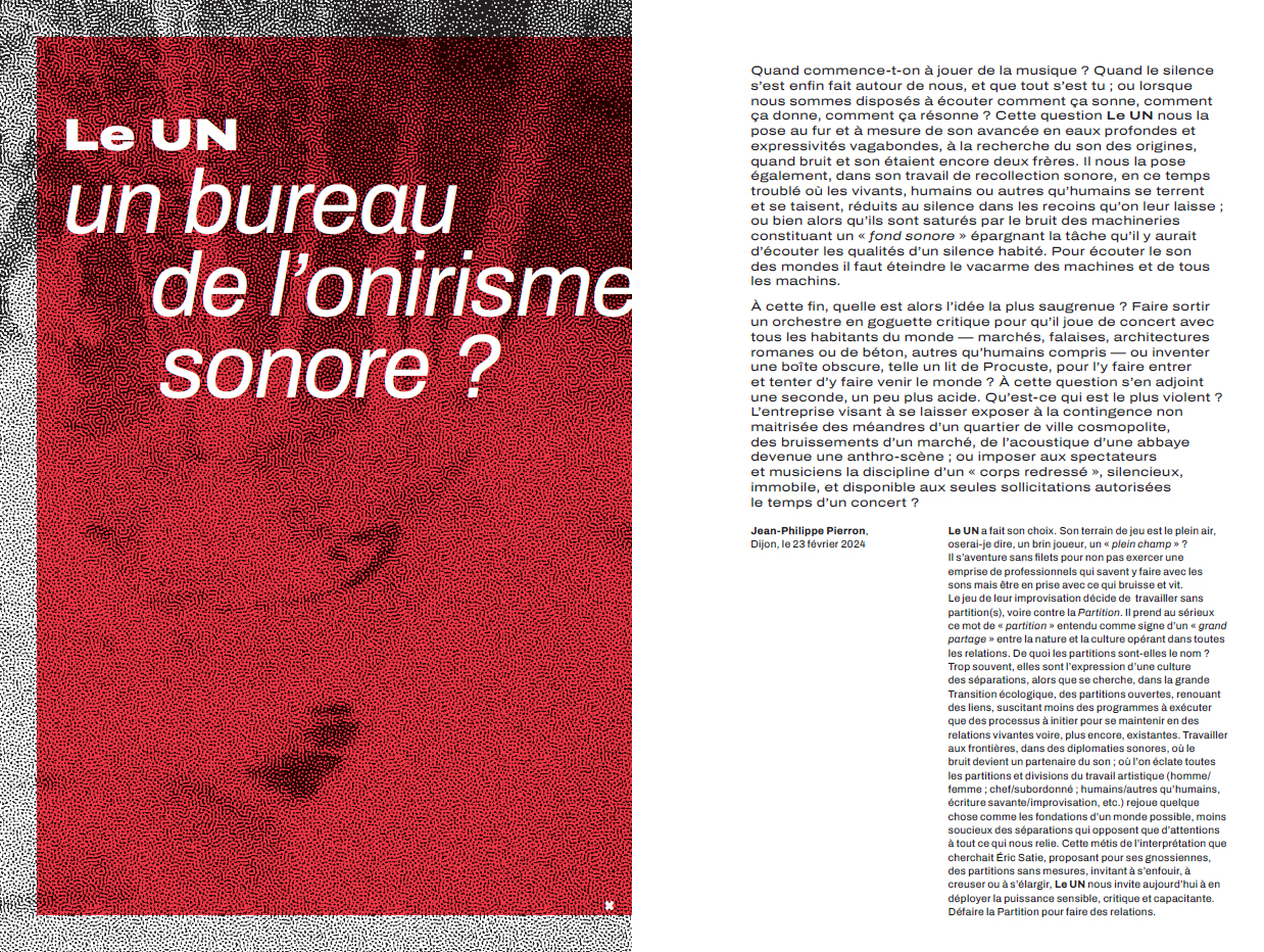 A three-CD set offering a glimpse into the work of the improvisation ensemble Le UN, featuring performances by a large ensemble in various acoustic settings (CDs 1 & 2), small and medium-sized ensembles, and outdoor performances in public spaces (light intervention brigade).
