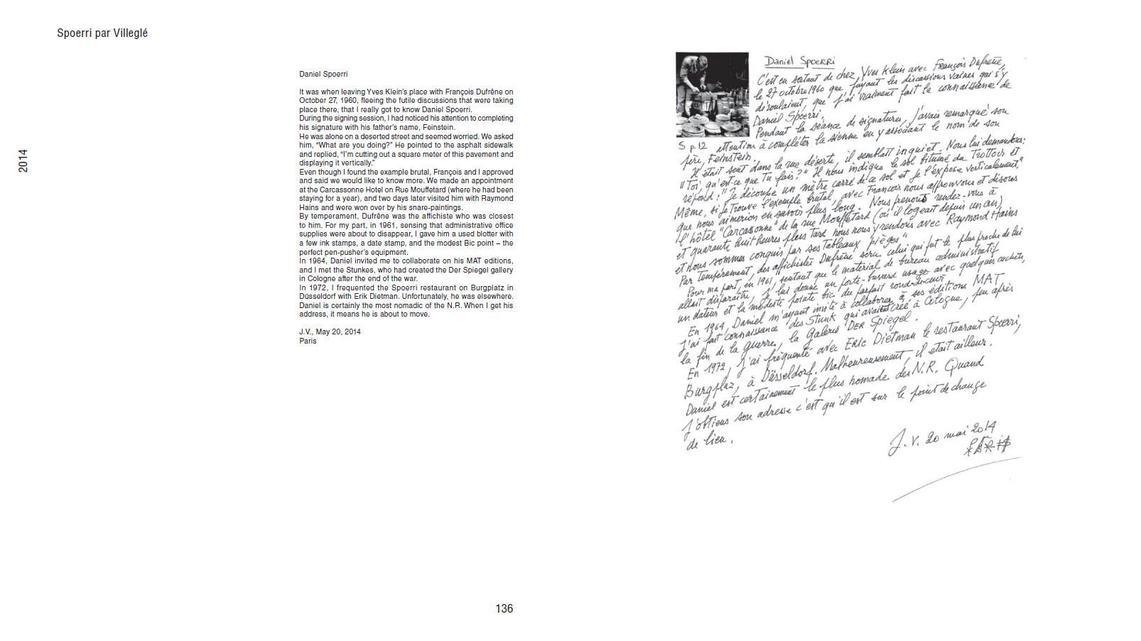Born Daniel Issac Feinstein in Romania in 1930, Daniel Spoerri became a Swiss citizen by adoption. He was, in turn, a poet, dancer, theater director, founder of the MAT publishing house, art curator, visual artist, and restaurateur. He considered himself stateless, having lived throughout Europe, and was a man of deep, wide-ranging, and artistic friendships. Spoerri, a founding member of New Realism, is one of the major artists of the 20th century.