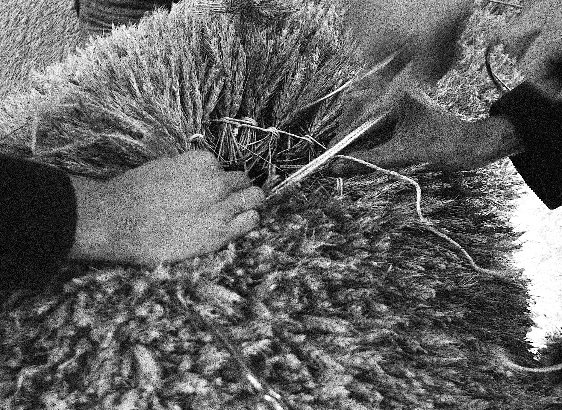 In its basic tenet, The Solemn Process was a collective action, performed by villagers at three farmsteads in the villages of Saliste and Margau in Romania, under the invitation, direction, and supervision of the artist. Drawing from ancient traditions of ceremony and ritual during harvest times, Lupas and her collaborators formed wreaths of wheat and other farm crops based on designs devised by Lupas and themselves inspired by traditional forms.