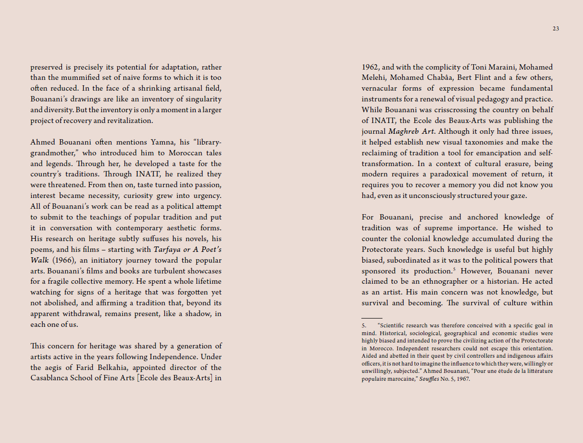 A series of drawings made during a field visit by the filmmaker, writer and artist Ahmed Bouanani. Here ethnographer and illustrator, Bouanani analyzes the construction of Berber jewelry by sketching a taxonomy and a geography of formal symbolism of Berber groups in Morocco.