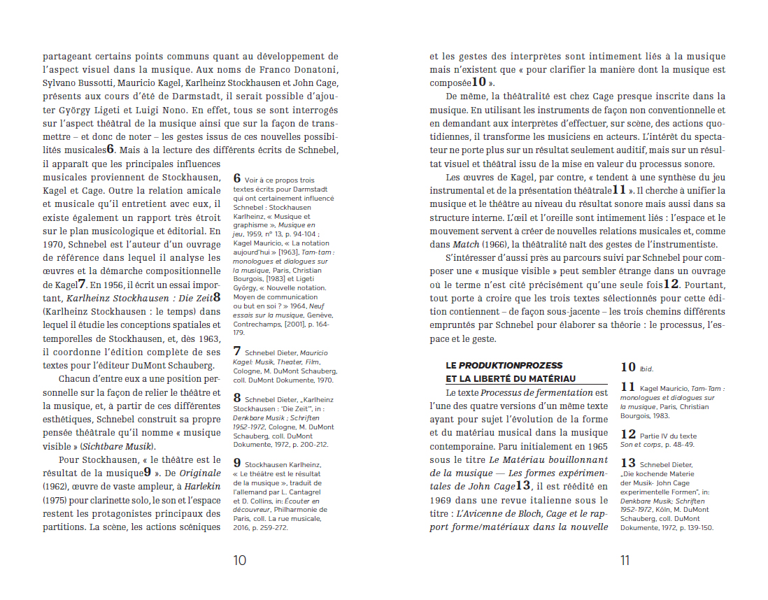 Pourtant, ils sont d'une incroyable actualité car Schnebel tente toujours de replacer la musique dans une perspective plus large, presque humaniste, dans laquelle l'interprète devient un élément central. Les textes traduits dans ce volume sont un témoignage précieux des recherches menées par Schnebel sur le lien musical qui existe entre le son et le corps et permettent de mieux comprendre une grande partie de sa production musicale entre 1960 et 1990.