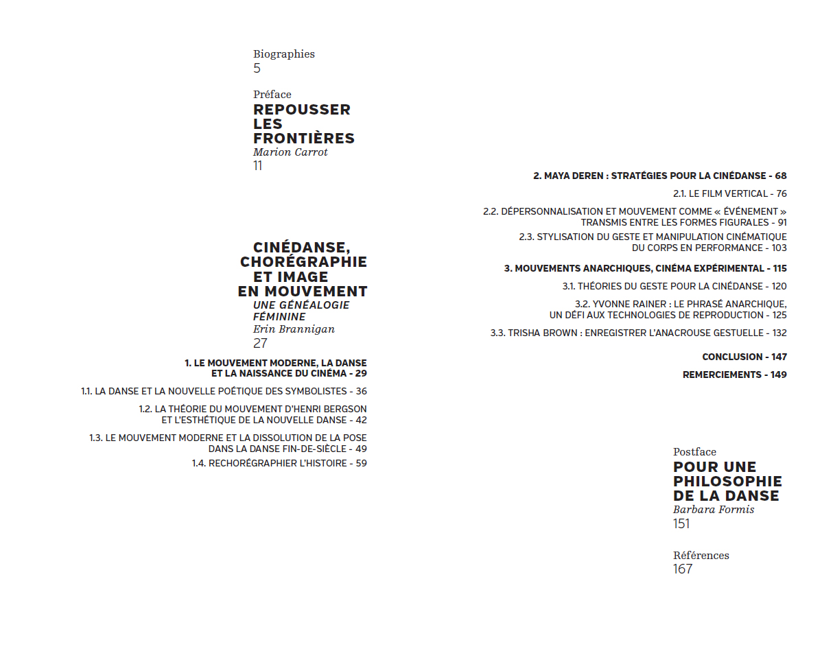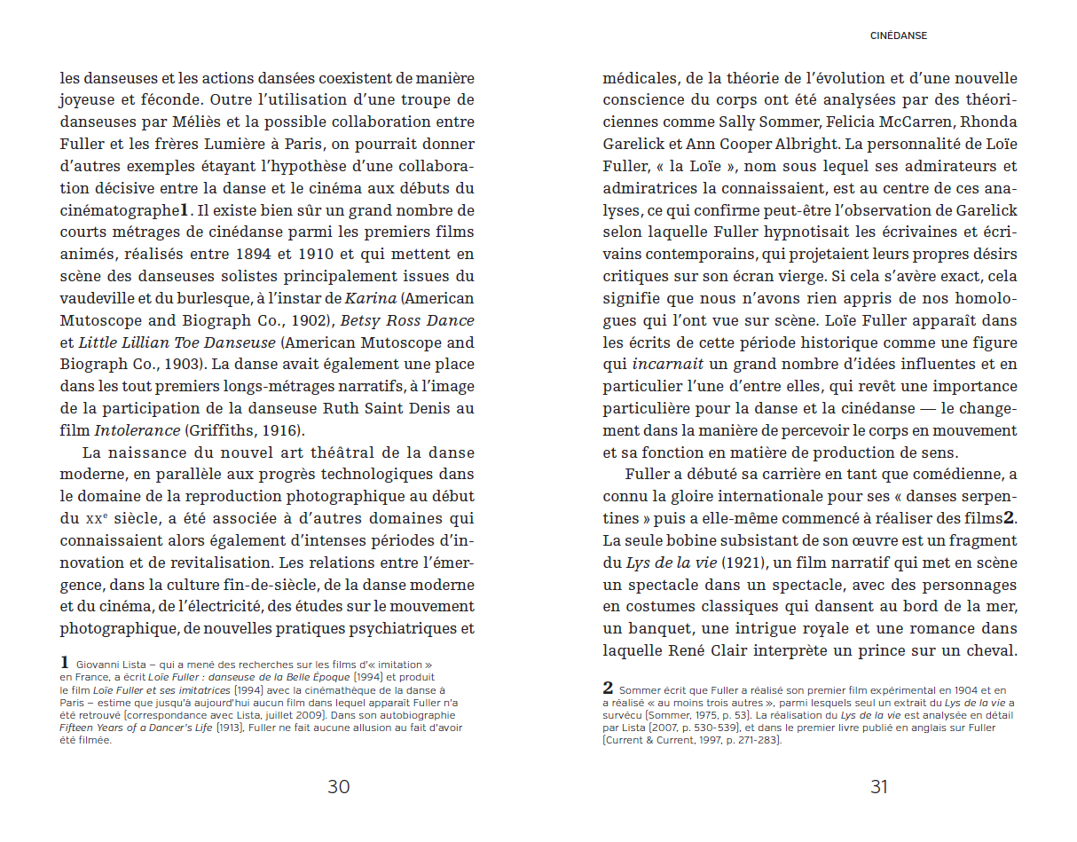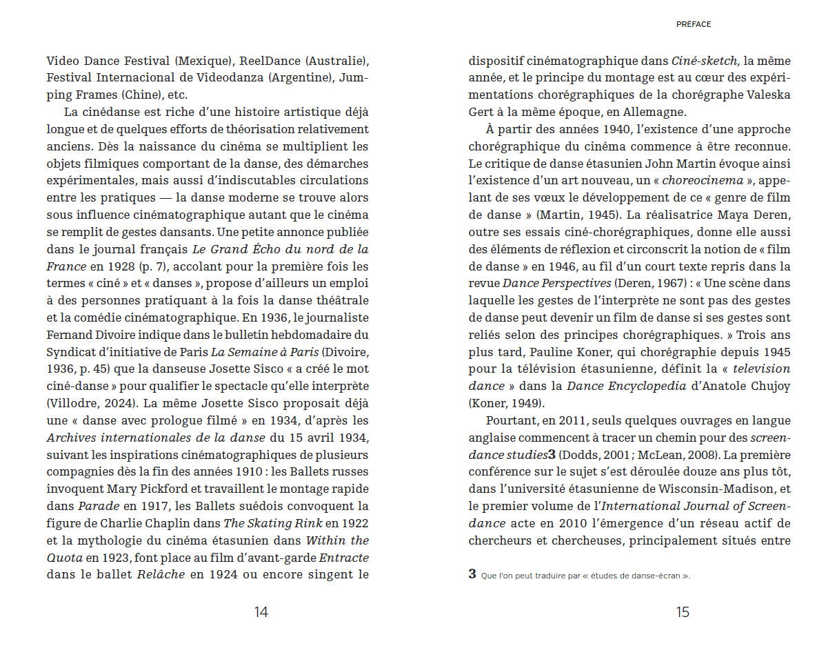 Ce livre retrace les grandes lignes d'une généalogie de la cinédanse, des avant-gardes du début du XXe siècle à l'essai vidéo contemporain, en s'arrêtant sur les inventions techniques et esthétiques de quelques pionnières de l'histoire de la danse et du cinéma. L'ouvrage présente la cinédanse comme une modalité qui défie les modèles familiers du mouvement cinématographique à travers sa relation au corps, au mouvement et au temps, générant de nouvelles catégories de performance filmique et créant des expériences somatiques chez les spectateurices. S'appuyant sur la théorie cinématographique, celle des arts visuels et l'étude de la danse, tout en convoquant la philosophie et la littérature, l'ouvrage défend l'idée que cette hybridation produit des pratiques ciné-chorégraphiques singulières, méritant d'être historicisées. Cette approche transdisciplinaire innovante permet d'aborder la cinédanse non pas comme un sous-champ de la création cinématographique, mais comme une forme de danse élargie.