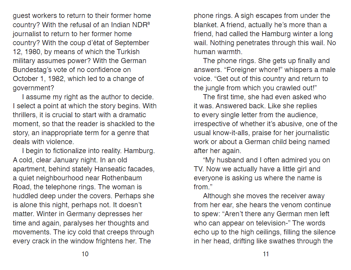 Navina Sundaram is sitting in an editing room in Hamburg. She has managed to reduce the complexity of the Kemual Altun case to the required two minutes and forty seconds for a political magazine; a journalistic feat considering the legal terminology and the international political situation. She places her interview with the trial judge at the back, foregrounding the best-known deportation prisoner of the republic. The phone rings. She answers. Peter says, "Did you hear? Kemal jumped out of the window in the courtroom. He's dead."