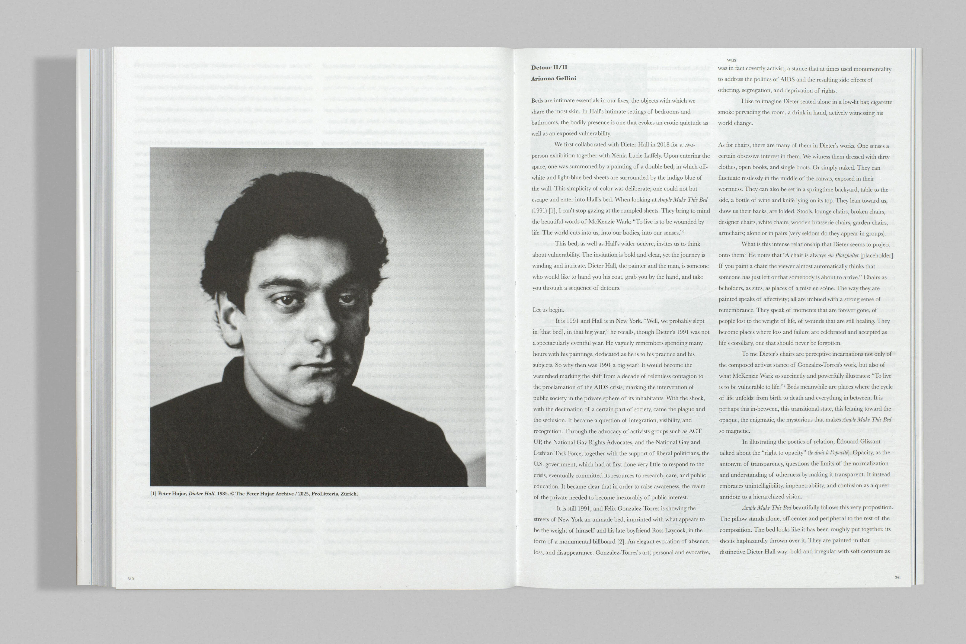 Peter Hujar. Hall était ami avec Hujar et évoluait dans le même milieu, jusqu'à la mort prématurée de ce dernier des suites du sida. La photographie joue un rôle essentiel dans le travail de Hall, mais elle n'est jamais une fin en soi : elle l'aide à composer ses images. Il sélectionne des détails – un pied ou une main, par exemple – et les transpose en peinture, réinventant ainsi complètement le sujet représenté. Les œuvres qui en résultent, caractérisées avant tout par leur intimité radicale, expriment l'isolement et un besoin profond de connexion.