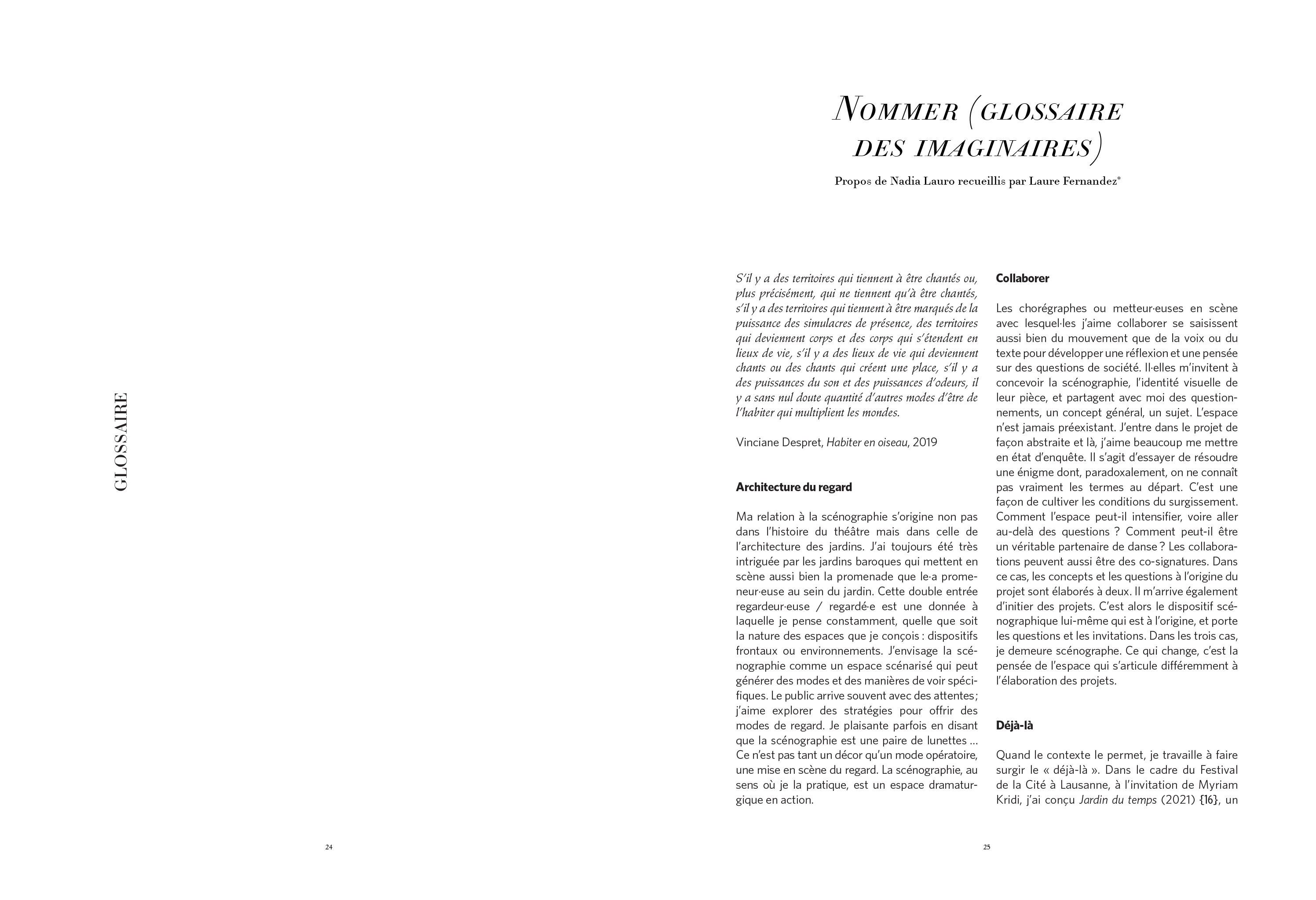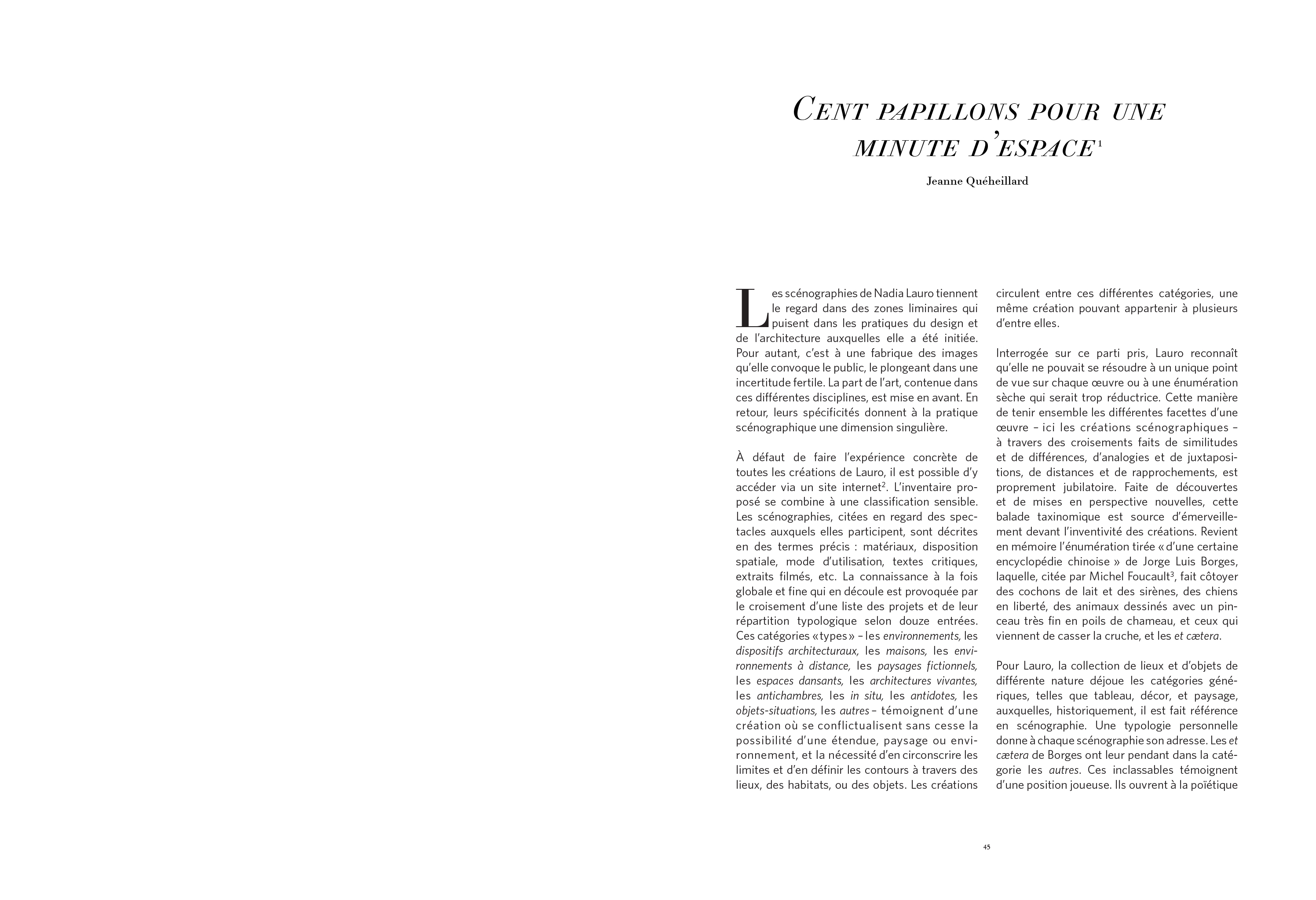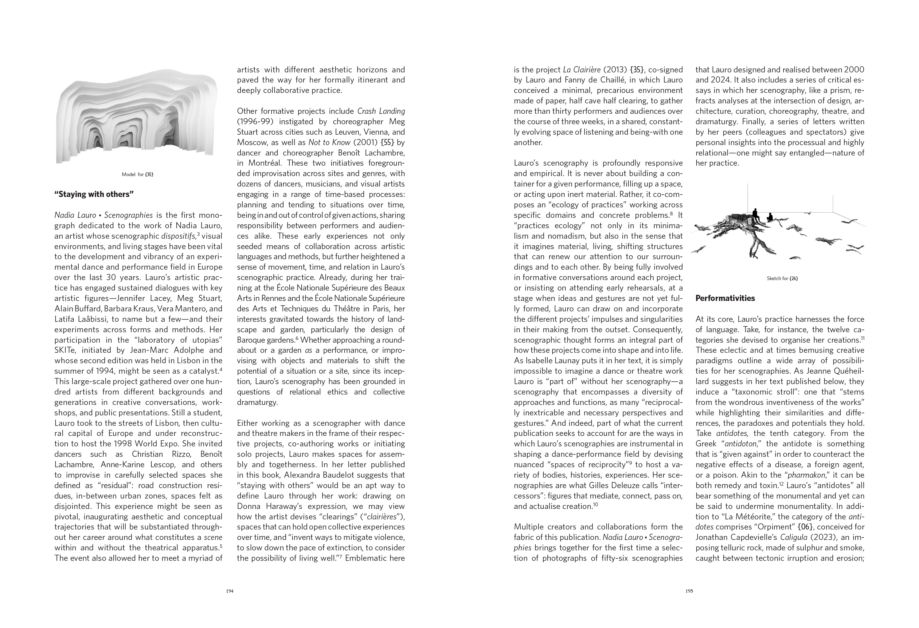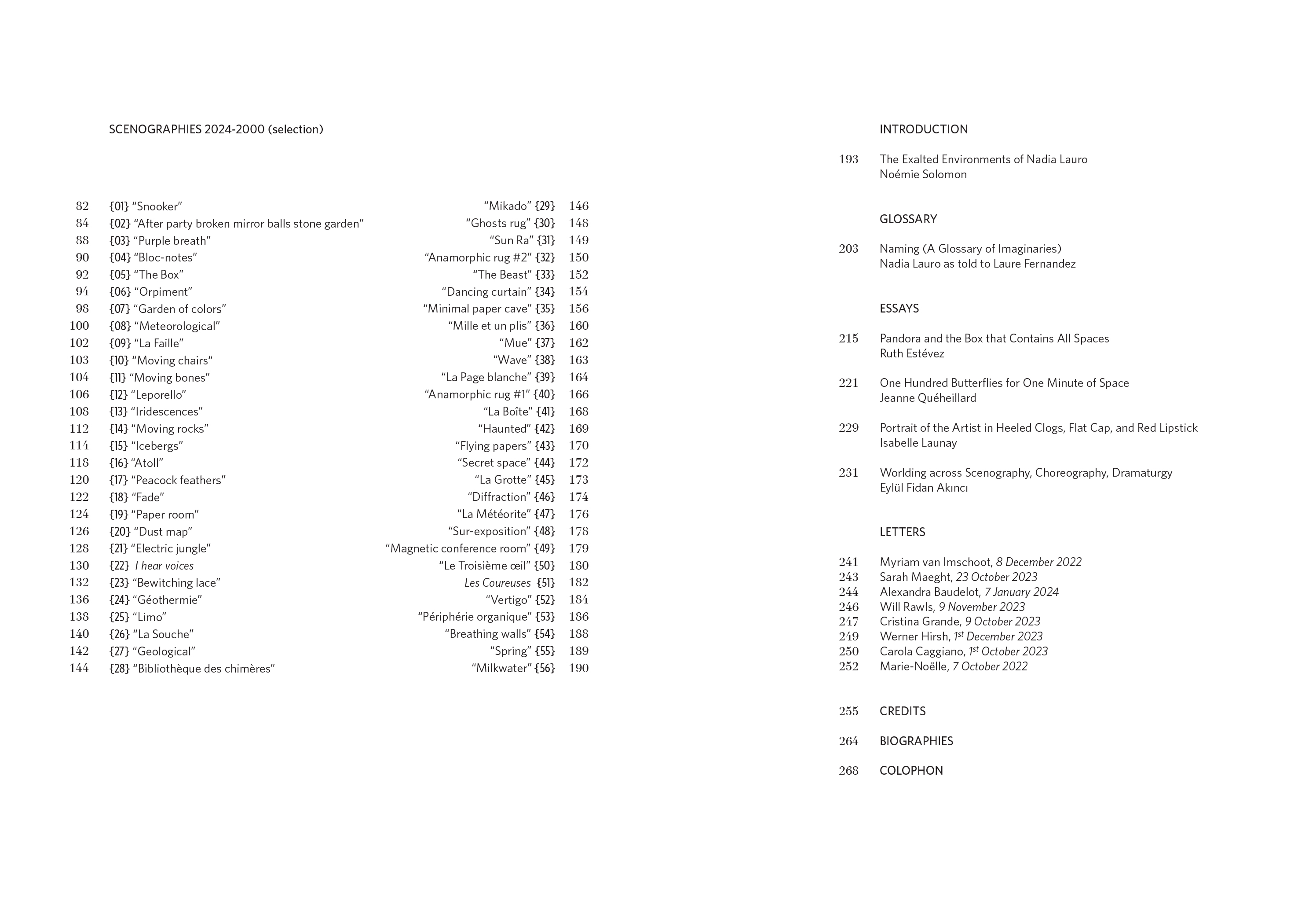 Ce livre richement illustré retrace l'épopée des dispositifs créés par Nadia Lauro, notamment au travers de multiples collaborations avec des chorégraphes et metteur·euses en scène emblématiques de leur temps tel·les que